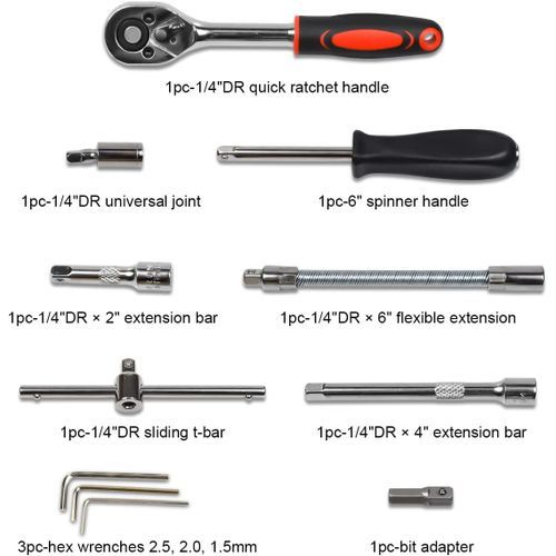 - 【Multi Extension Bars】 Small socket set included multi extension bars is suitable for various scenarios: 1pc 1/4"dr universal joint, 1pc 1/4"dr × 2" extension bar, 1pc 1/4"dr × 4" extension bar, 1pc 1/4"dr × 6" flexible extension, 1pc 1/4"dr sliding t-bar, 1pc 1/4"dr sliding t-bar, 1pc 6" spinner handle , 1pc-bit adapter and 3pc-hex wrenches 2.5, 2.0, 1.5mm