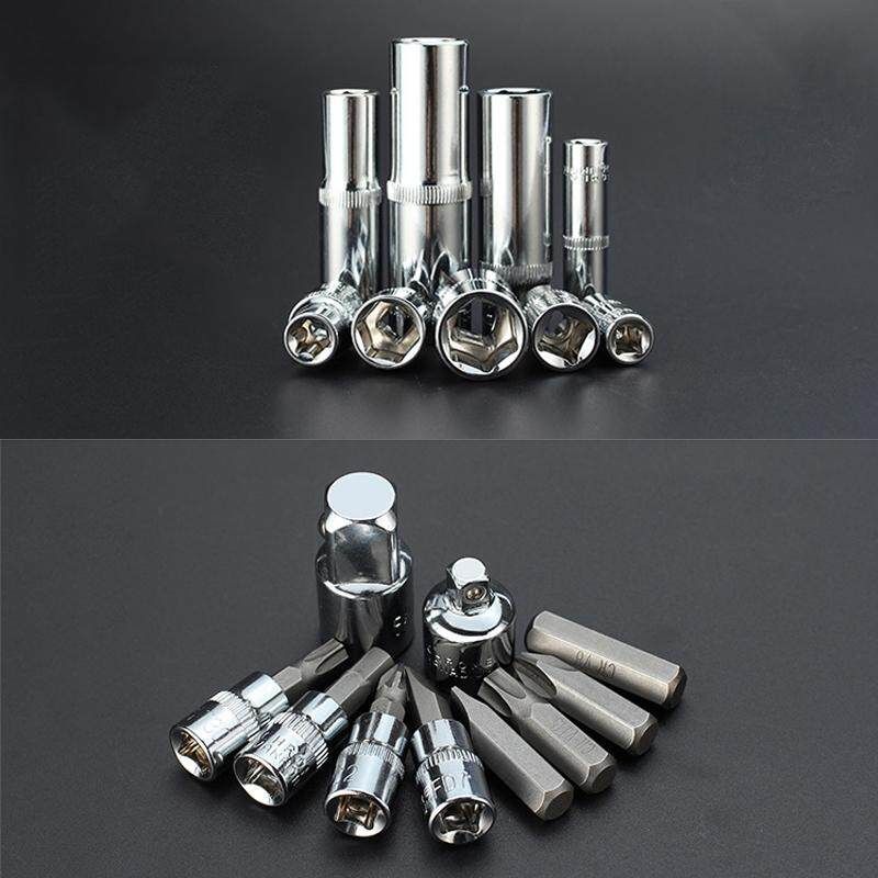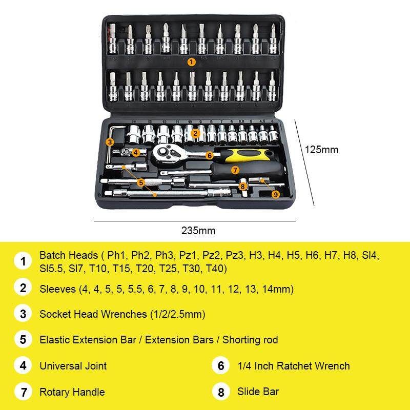 46pcs Car Auto Automobile Motorcycle Repair Tool Ratchet Wrench Drive Socket Set with Plastic Toolbox Storage Case Specifications: 1.Complete DIY Tool Kit:The tools set comes with 46 pieces tools, meet you different needs, including sleeve, ratchet wrench and batch head, etc. 2.Easy To Stock and Carry:It comes in a in a sturdy plastic storage toolbox so you can easily store it once you have. Very easy for easy storage and transportation(Size: 235x125x45mm) 3.High Quality: Made of high quality chrome vanadium steel, durable and long service life. High strength, high corrosion-resistance, durable and practical 4.Widely Application:The tool set can be used in automotive industry, household maintenance, manufacturing industry, construction and so on. Package Includeds: 21 X 1/4 Inch Batch Heads( Ph1, Ph2, Ph3, Pz1, Pz2, Pz3, H3, H4, H5, H6, H7, H8, Sl4, Sl5.5, Sl7, T10, T15, T20, T25, T30, T40 13 X Sleeves: 4, 4, 5, 5, 5.5, 6, 7, 8, 9, 10, 11, 12, 13, 14mm) 3 X Socket Head Wrenches(1/2/2.5mm) 1 X Slide Bar 1 X Elastic Extension Bar 1 X Extension Bars 1 X Shorting rod 1 X 1/4 Inch Ratchet Wrench 1 X Universal Joint 1 X Screw connector 1 X Rotary handle 1 X Package box