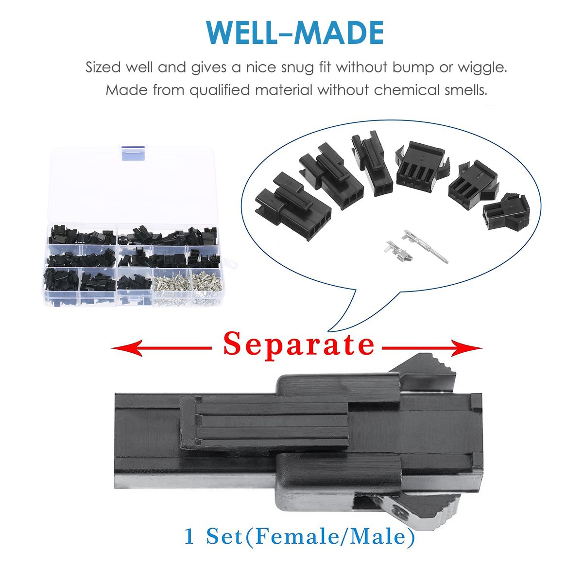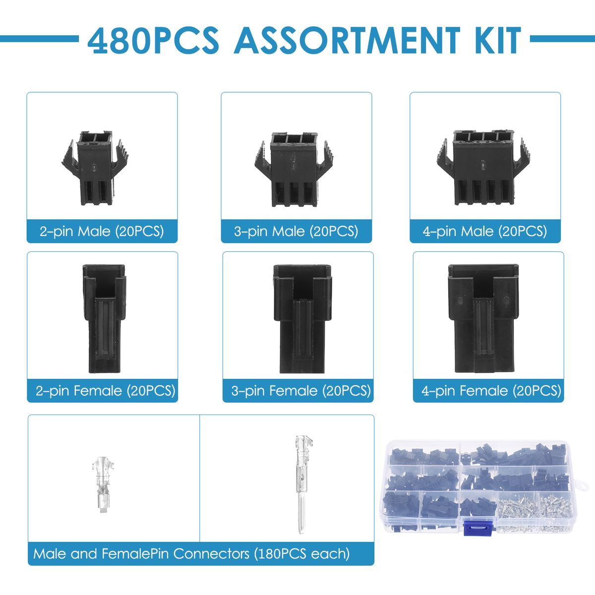 480PCS KIT: Includes male and female connector housings of 2-pin, 3-pin and 4-pin(20 pcs each); male and female pin connectors(180pcs each).