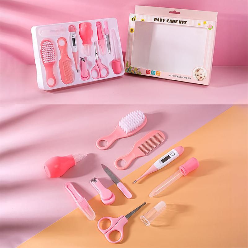 10 pcs Aset: 1 ×Nasal aspirator,1 ×Finger Toothbrush,1 ×Brush,1 ×Thermometer,1 ×Nail scissors,1 ×Round head scissors,1 ×Comb,1 ×Nail file,1×Tweezers,1 ×Baby medicine feeder.
