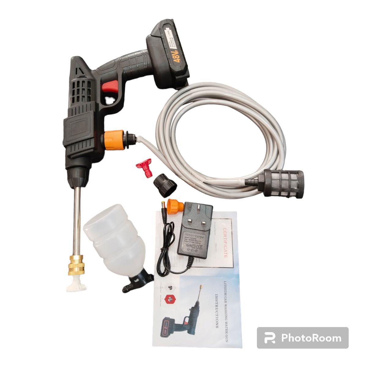 The length of the outlet pipe: 5mIt is easy to start in that you insert the 48vf battery and then get started. The handheld pressure washer allows you to start immediately with cleaning freely and without cables .