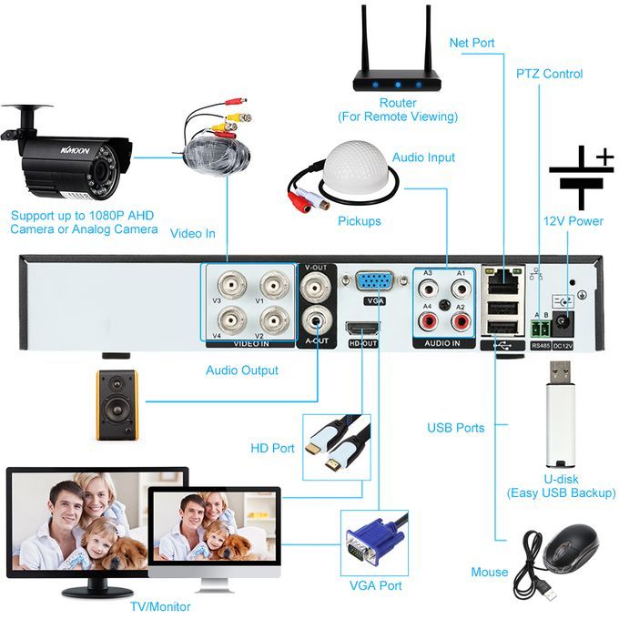 This 4 Channel 1080p surveillance DVR features plug and play, uncompressed, point-to-point raw data,2.0 Megapixel 1920×1080 Pro HD video transmission up to 1920×1080p. Supports Live View 1080p. Recording & Playback 1080n.