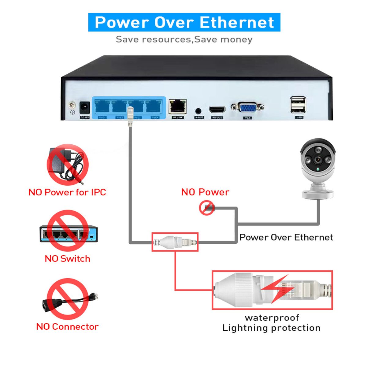 Description: POE NVR connects POE IP cameras via Ethernet cables directly, you don\'t need to supply power for each camera This system works with virtually any compatible POE IP camera and after a quick plug-and-play setup process, then you can remotely video