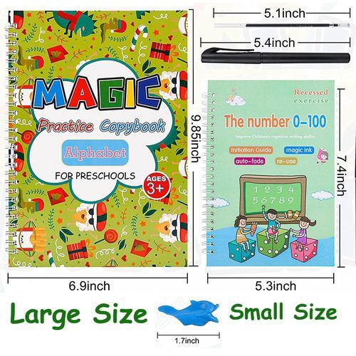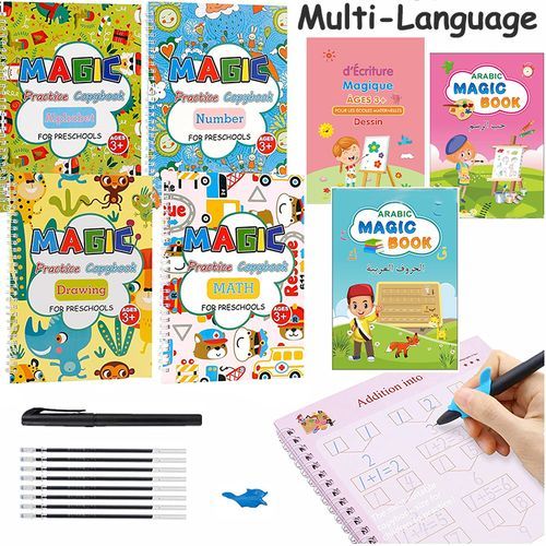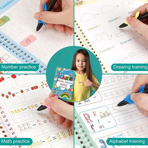 Product Description The package includes: 4 x handwritten English magic copybook (1 addition and subtraction + 1 picture + 1 letter + 1 number) and 1 x automatic fade pen (1 pen holder + 1 pen box + 8 refills). Our philosophy: VLOJELRY calligraphy copybook allows your children to easily and happily learn handwriting, arithmetic, drawing and other skills before going to school. Children's beautiful calligraphy will make parents proud, especially in a social envment that is increasingly surrounded by the Internet and smartphones. Magical reusable function: the handwriting will disappear automatically ar drying, which is very suitable for repeated practice. Calligraphy books have a standard writing format, and high-quty paper will be strong and durable. Rich content: The content contains 26 English letters, daily words, 0-100 numbers, simple addition and subtraction, and common shapes, plants and animals, and colorful patterns to make children interested in the exercises. Great gifts: These are great gifts for kids and can be used to draw letters and preschool math. Become a child's initiation teacher.