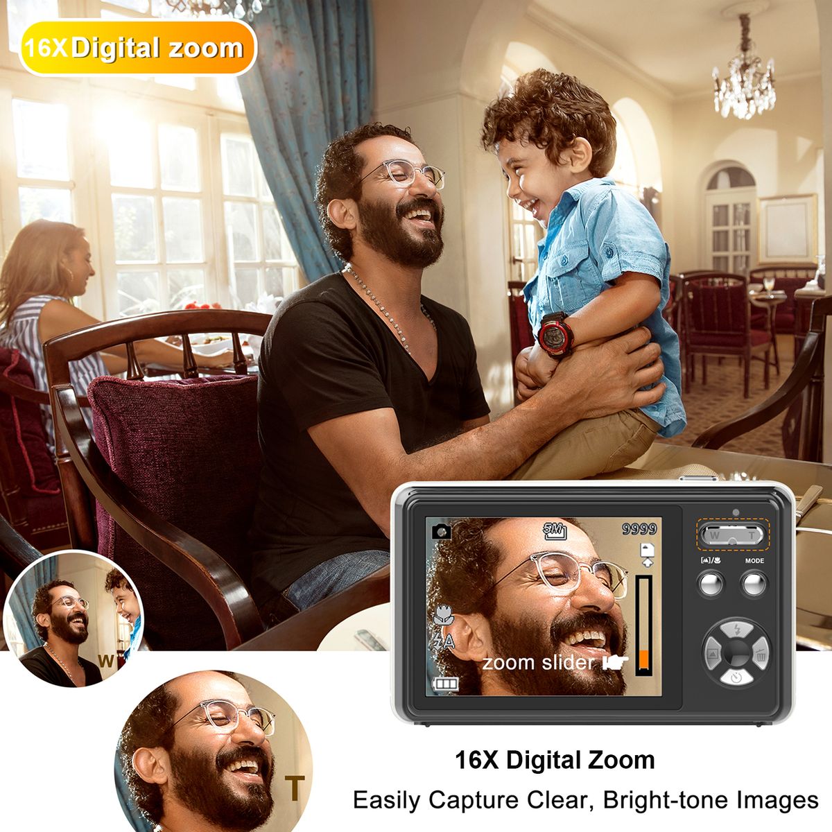 The 16X digital zoom function can enlarge your picture to capture the details you want. Comes with a 32GB TF memory card.