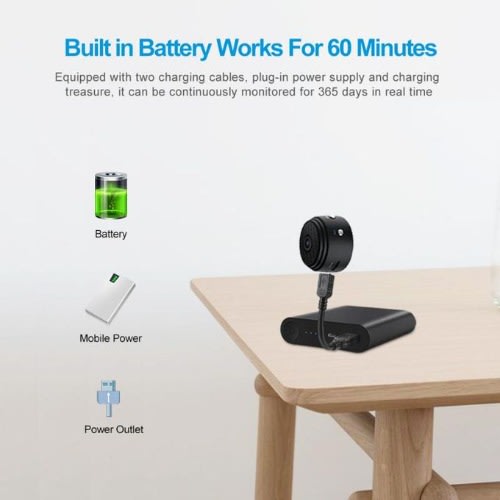 Mini cctv wifi camera with 1080p HD viewAlthough it is powered by inbuilt battery 3.7-4.2V 500Mah, it can last for just about an hour so it is recommended to be plugged to power alwaysPower supply: 5.2-5V 1A. video recording range: 5m2