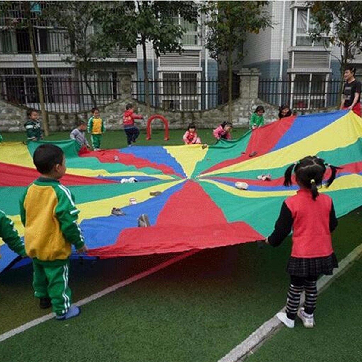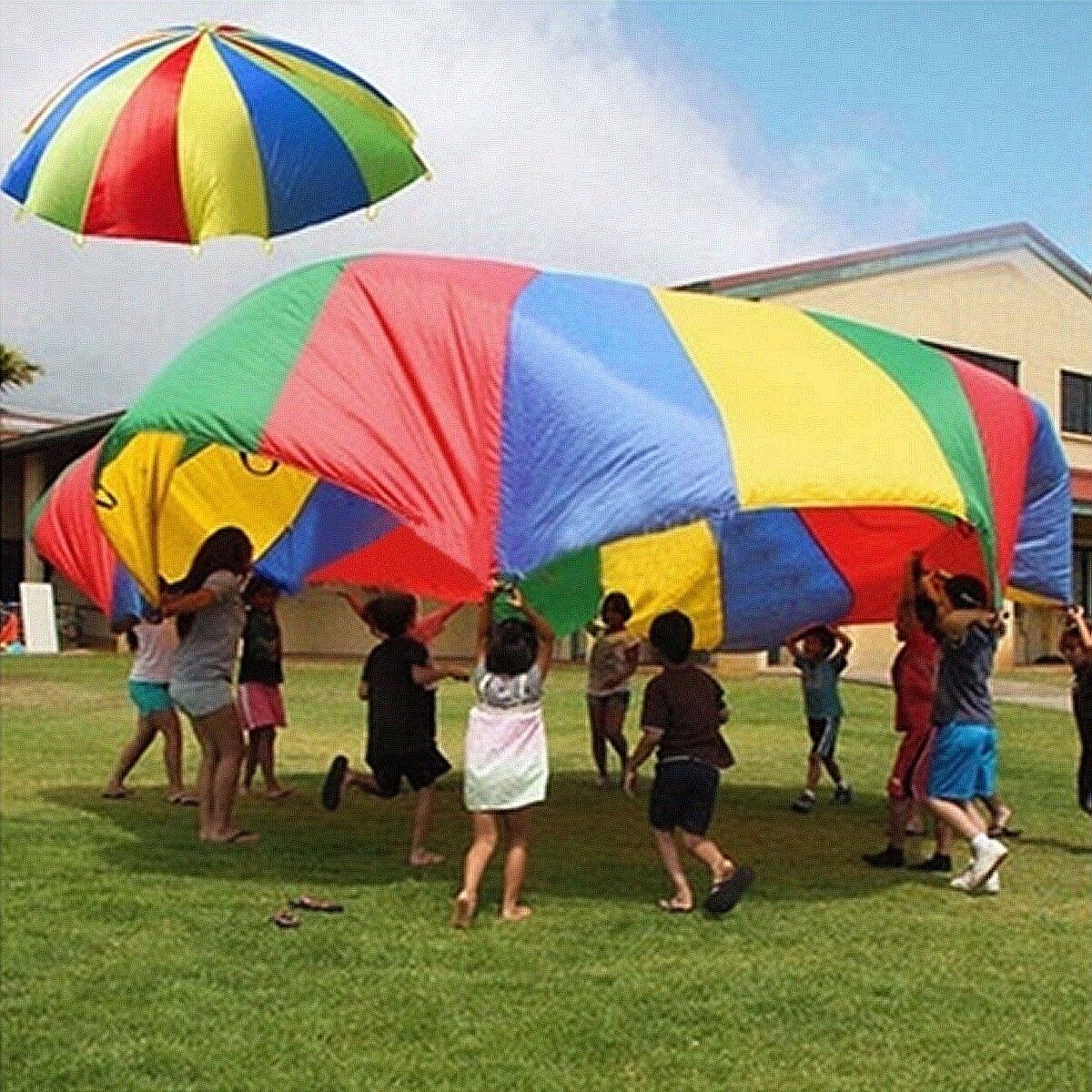 This Parachute is 4 meters in diameter, allowing at least 12-18 people to play together, its the best toy for adults to enjoy fun with kids, to create happy memory