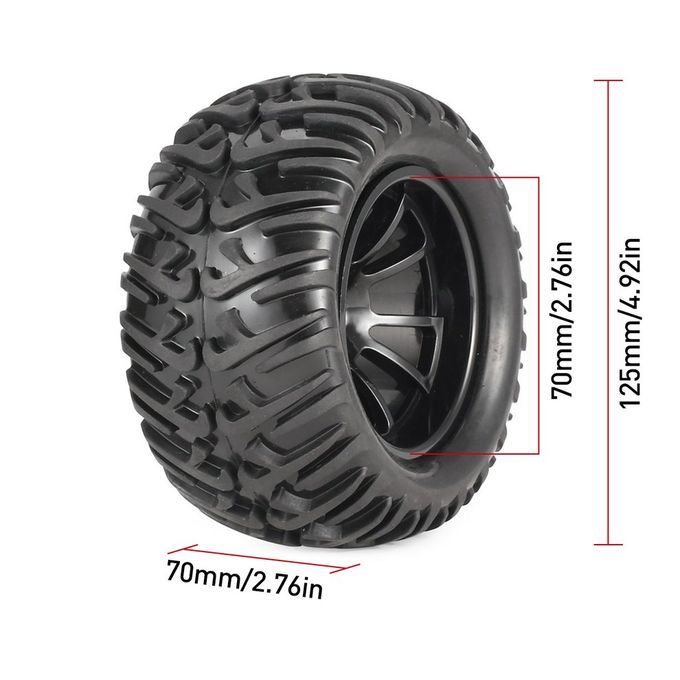 Spe ifi ations: : 7, 10(optional) Item name:1 / 10 wheels and tyres Y-shaped tire pattern: olor: Bla k Wheel rim material: ABS Wheel rim diameter: 70mm Material: rubber tyre Tire outside diameter: Y-shaped tire pattern: 125mm Publi Word pattern: 120mm The width of the tire. Y-shaped tire pattern: 70mm Publi Word pattern: 55mm Suitable for: 1 / 10 monster tru k ar Quantity: 4 pz Item weight: Y-shaped tire pattern: 163g / p s Publi Word pattern: 131g / p s