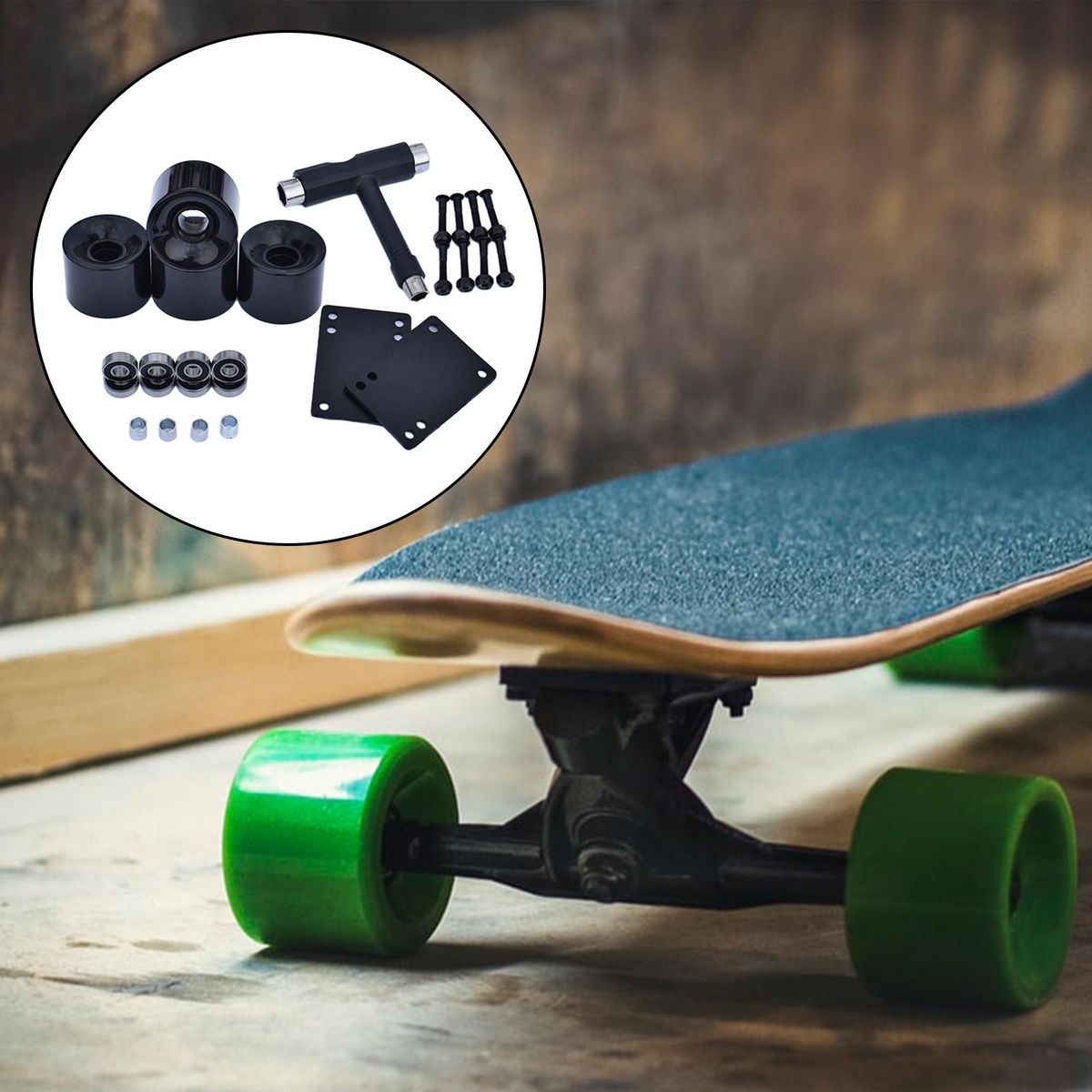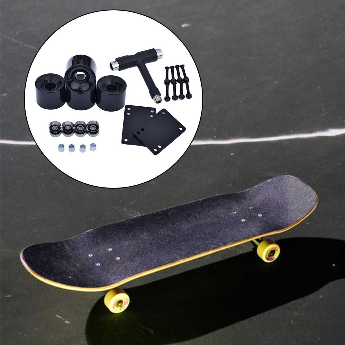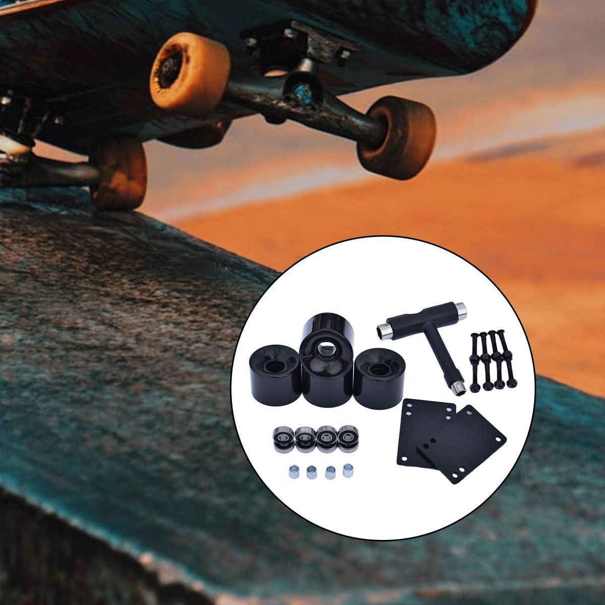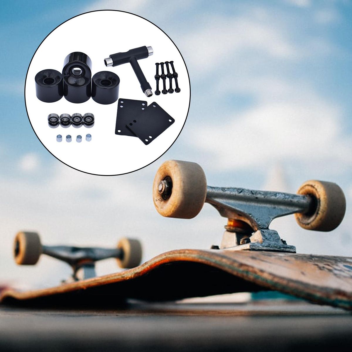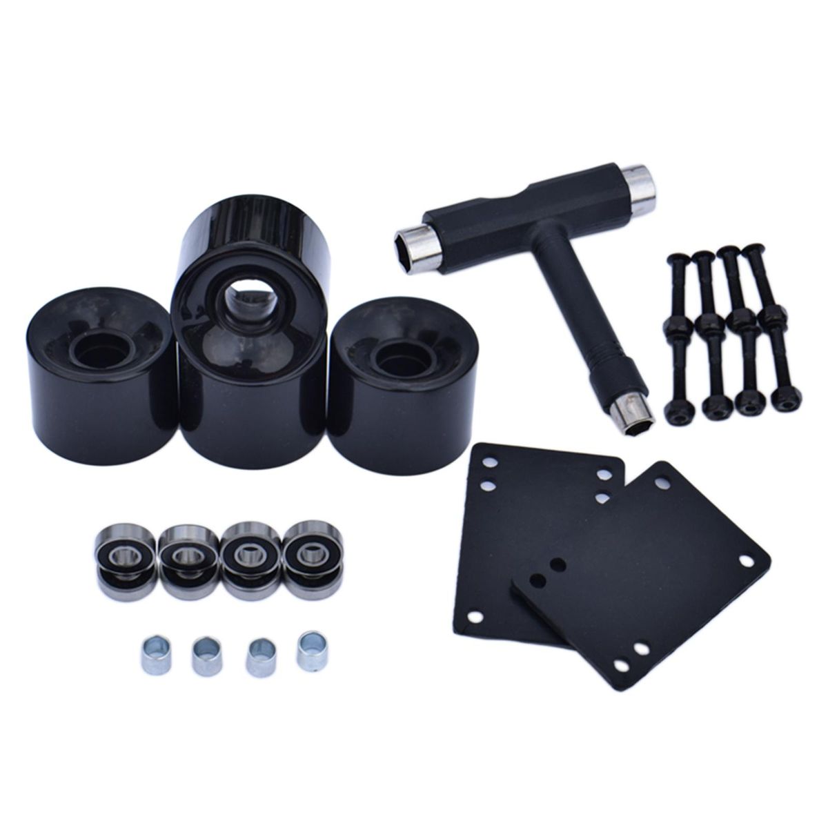 4 Pieces Skateboard PU Wheels8 Pieces ABEC-9 Bearings4 Pieces Bearing Sleeves8 Pairs 30mm Bridge Nails1 Set 3mm Gasket1 Piece T Tool