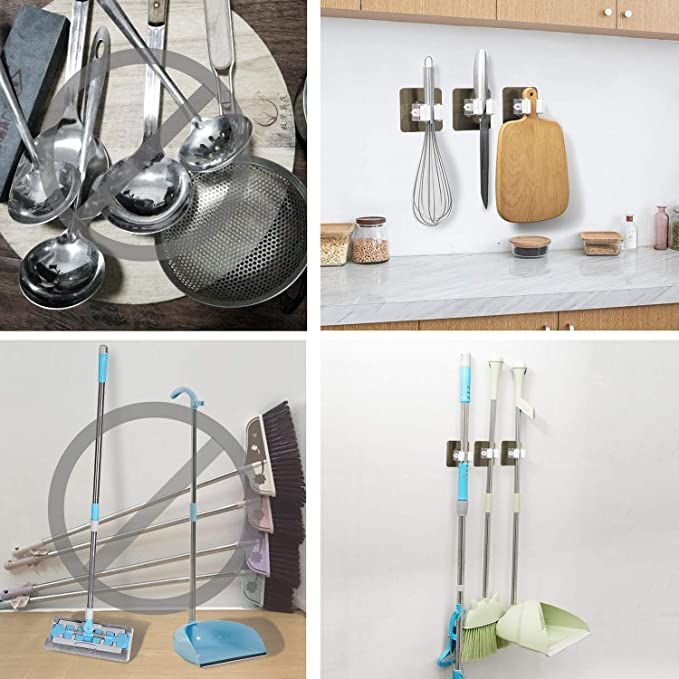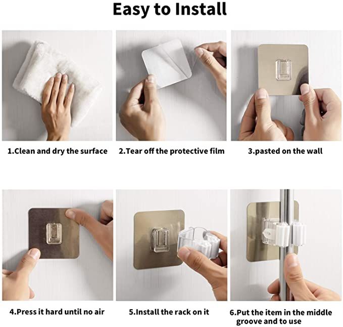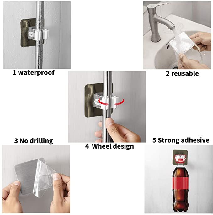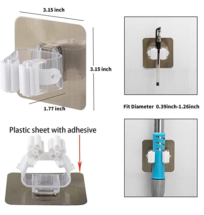【Home Help】This Mop Broom Holder have a roller design, easy to access, keep home clean and tidy, and make people feel happy and comfortable 【Reusable】After washing the surface, dry this broom clips mop grippers with a hair dryer and reattach them for use 【Multi-Use】This self-adhesive mop broom racks can suitable for some goods, not only can hang mops, brooms, but also some kitchen supplies, repair tools, umbrellas, keys, etc. 【Wide Application】 This super anti-slip utility hooks can be stick to any smooth and flat surfaces like ceramic tile, wood, plastic, metal, mirror, glass and other surface, Please ensure the surface is dry before you paste them 【Easy to Install】 Needs no drilling, come with a double-sided adhesive, just tear off the protective film and stick them on the clean wall, you don't have to worry about this holders damage the wall of your house