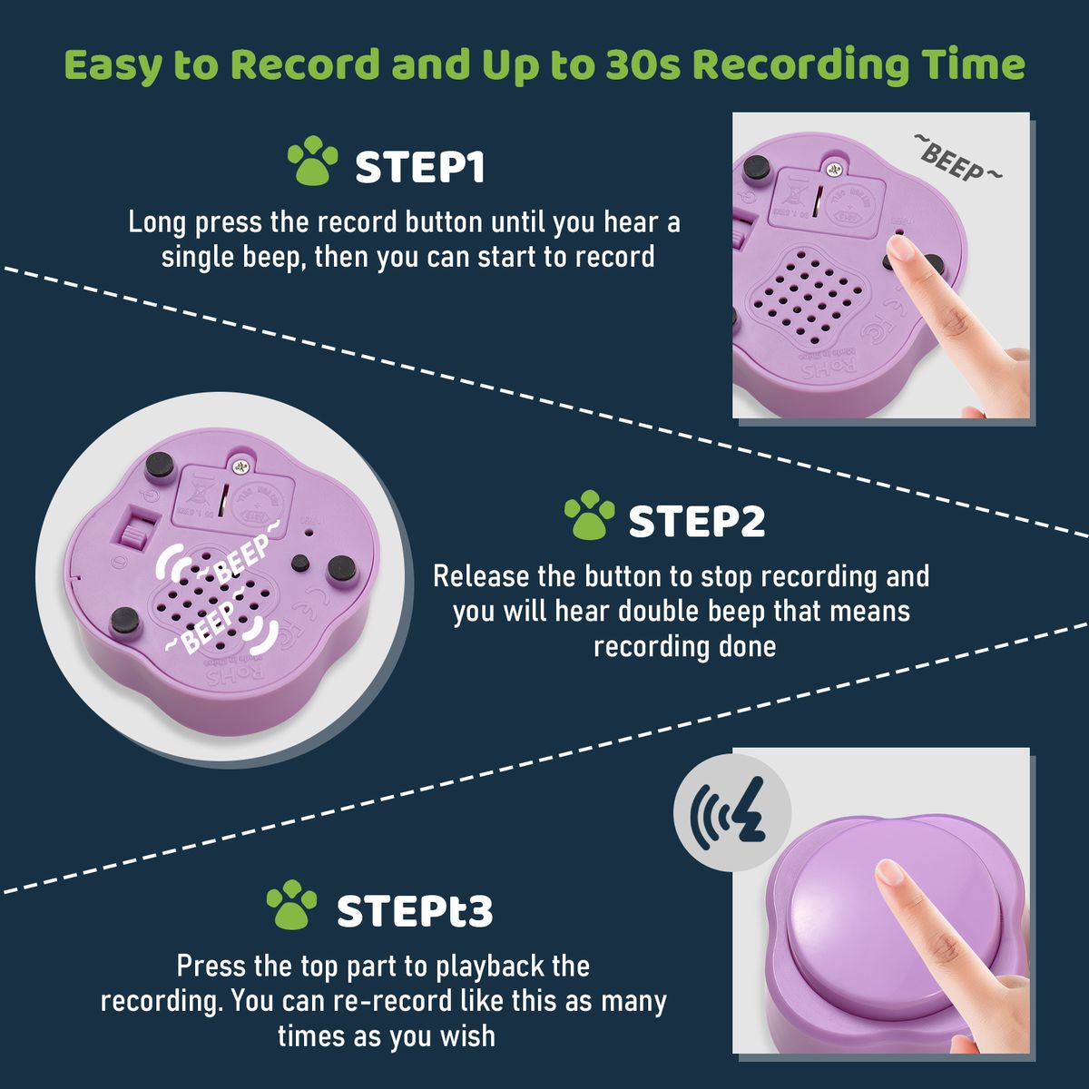 【Easy to Use the Pet Talking Buttons】Long press the small black button at the bottom until you hear a single beep, then hold the pet talking button close to your mouth and start to record the voice. Release the button to stop recording and you will hear double beep that means recording done. Press the top part to playback the recording. You can re-record like this as many times as you wish.