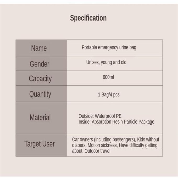 The urine bag contains a rapid hardening resin particle package, which can absorb urine, vomit or other waste and turns it into odorless, spill-proof in 1 minute.