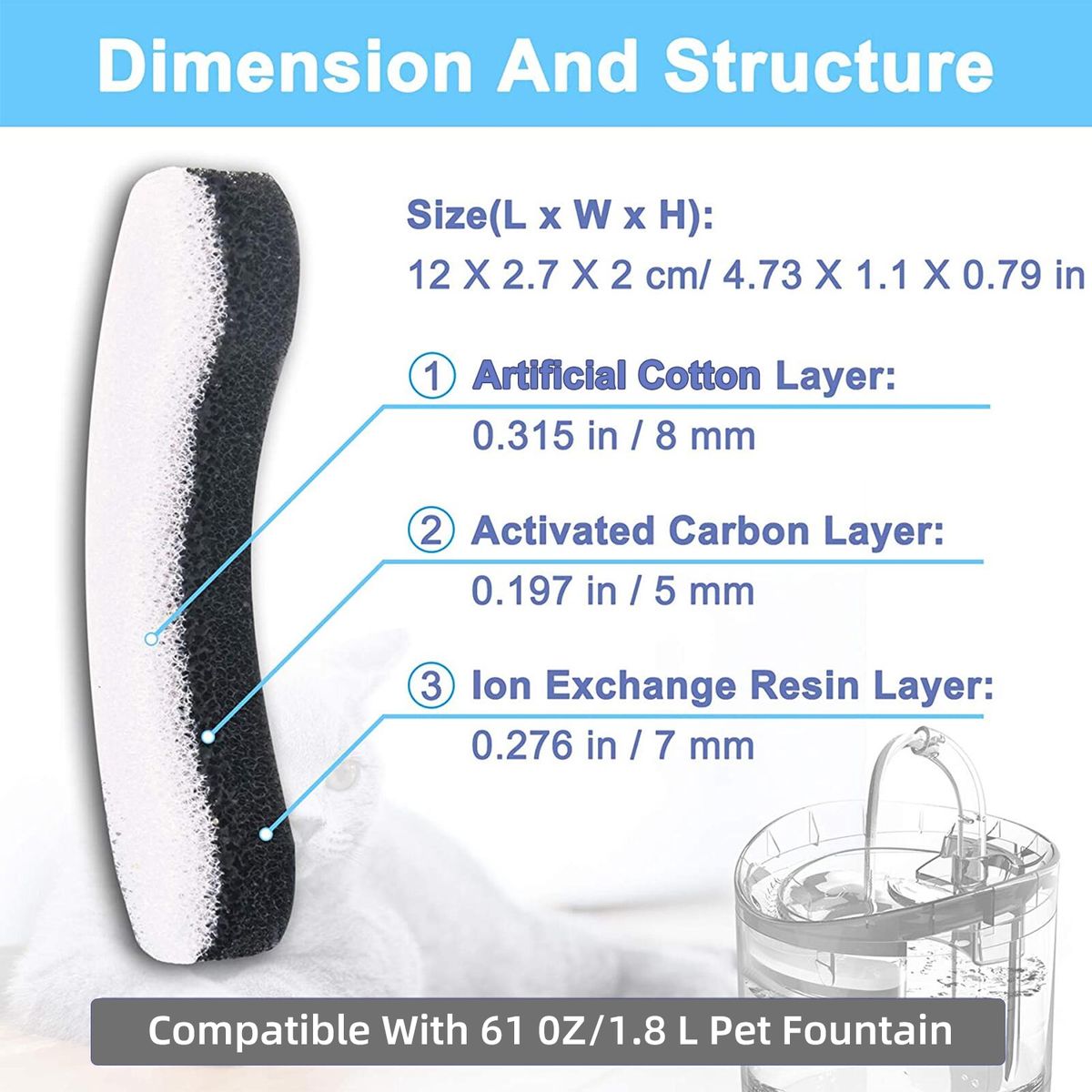 Size: 12x2.7x2cm.Composed of 4pcs, this set is suitable for the 1.8L pet fountain.