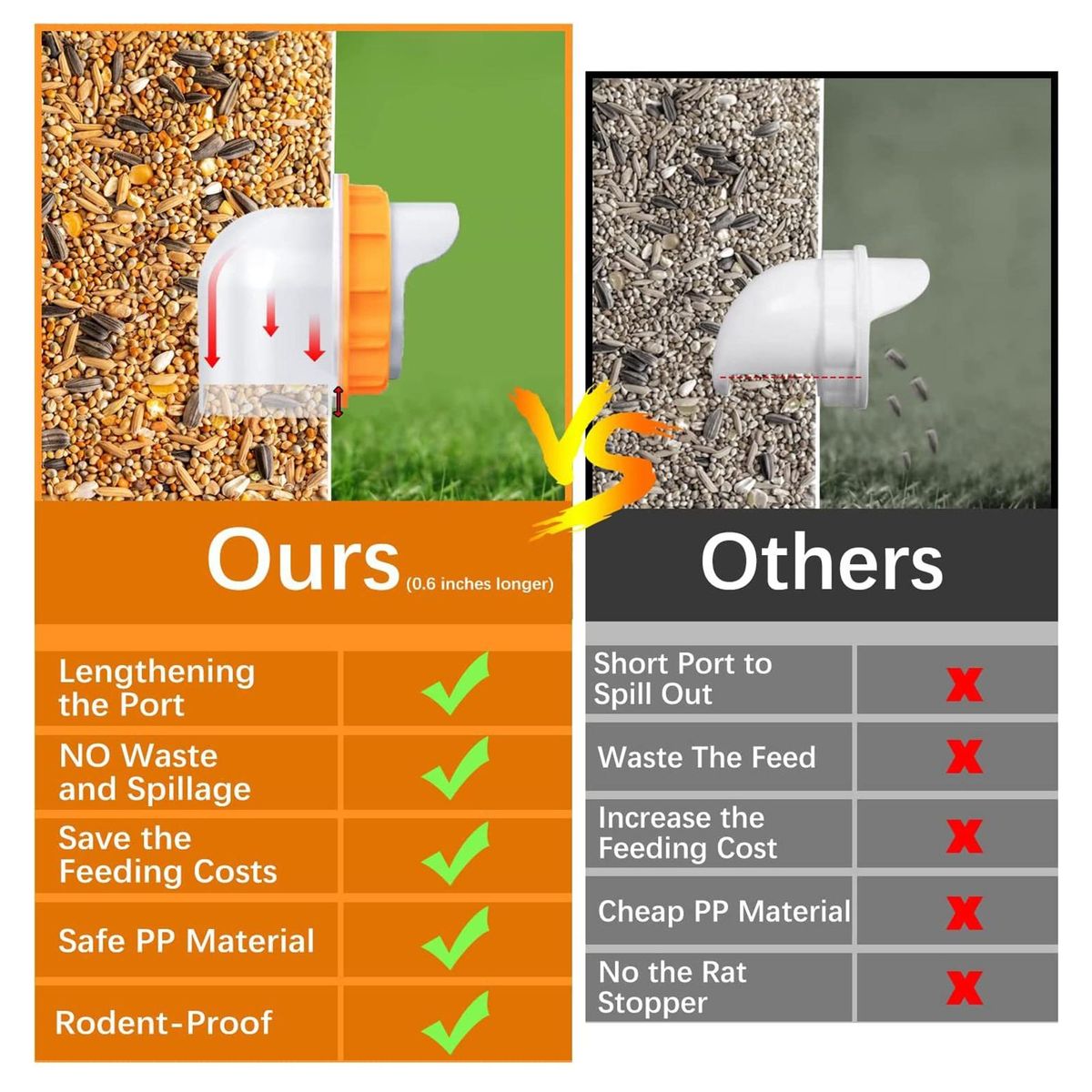 There is a wider roof design on this chicken feeder for better protection against rain and a strong joint/seal design to keep food dry and clean at all times, even in the rain.