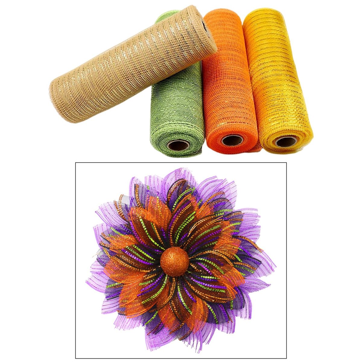 Hight Quality: Mesh Ribbon Rolls are made from premium quality pp plastic material, this mesh is flexible, lightweight, durable and reusable. Our mesh ribbon can holds its shape well.The edge is clean, have no any loose threads.Length: Mesh cloth Width 26cm, Length 10 yards decor mesh ribbon, great for DIY various decorating projects .Easy to Use: Easily cut the mesh ribbon into your desired length and attach to almost any surface using , thread or tape.Widely Use: Perfect for making bows, wreaths, garlands, gift baskets and other craft home decor projects. Just use your imagination.Package Includes: 4 Rolls 10 Yards/30 feet, Width 26cm/10.24 inch Metallic Poly Mesh Ribbon.