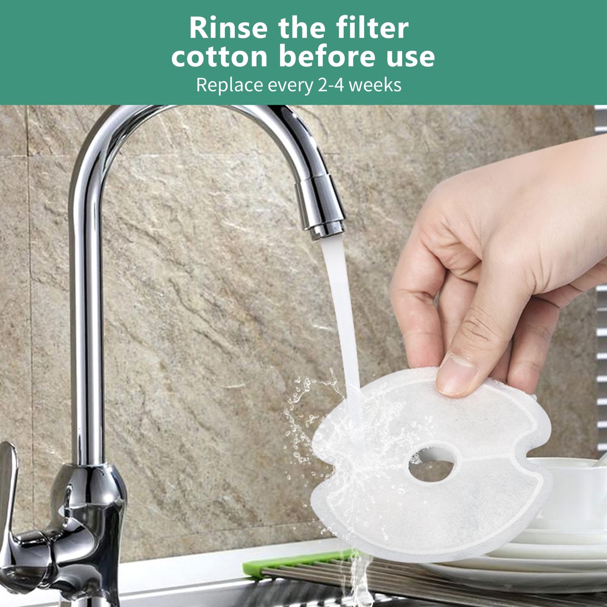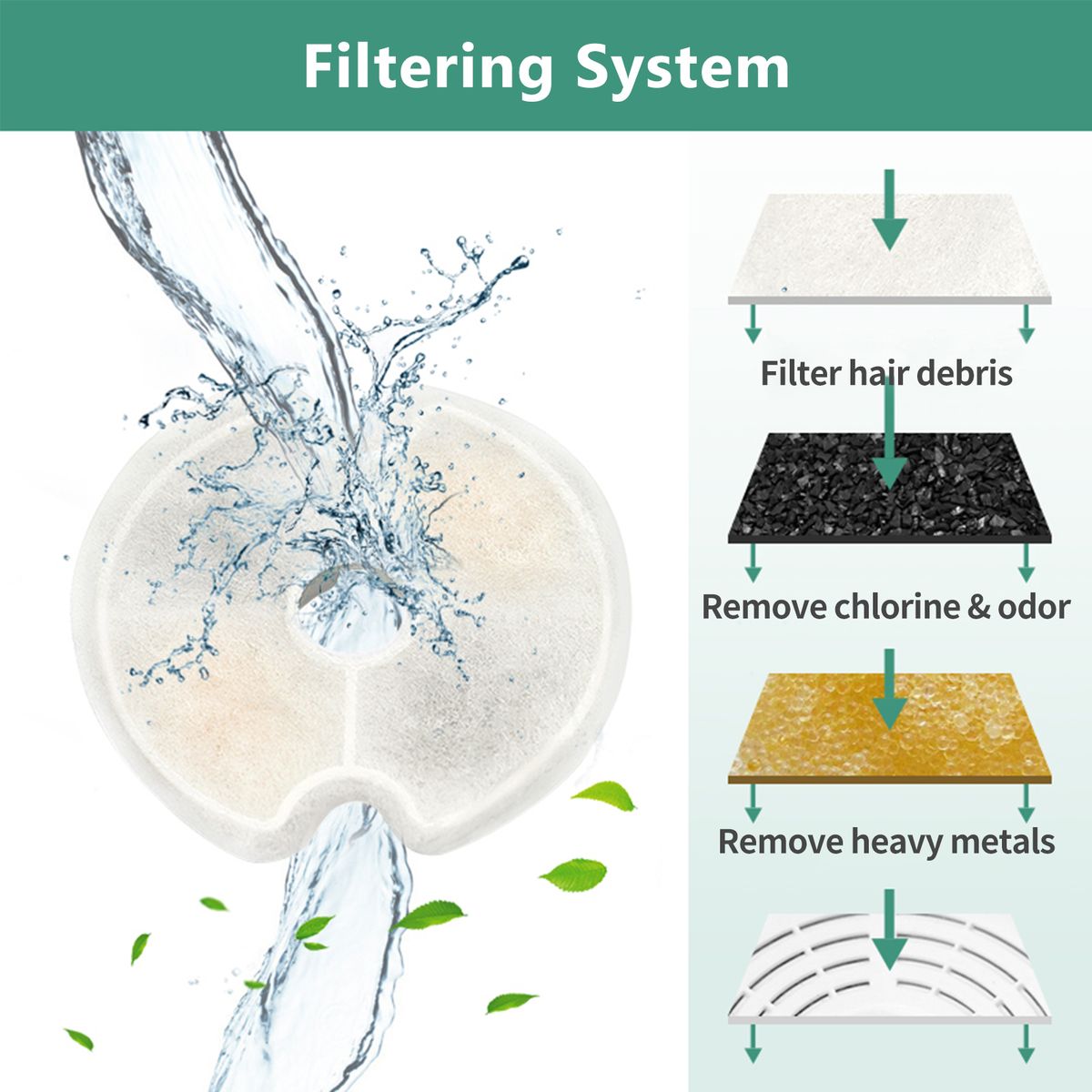 [Filter]The cat water dispenser includes a 2pcs filter. It not only filters hair, impurities but also eliminates odor, softens hard water to improve the taste.