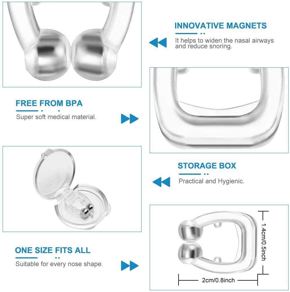 1.The powerful magnetic anti snoring device ensures effective stimulation of the sensory nerves of the nose and helps promote better blood flow, while promoting air circulation in the nasal cavity and increasing air flow 2.The magnetic nose clip is made of soft silicone, Safety And Harmle-Medical Silicone is soft transparent and BPA-free silicone offers a comfortable fit and a pleasant handling. 3.The Silicone Magnetic Anti Snore Clip not only prevents the usual snoring, change the habit of oral respiration during sleeping and prevent upper y infection。