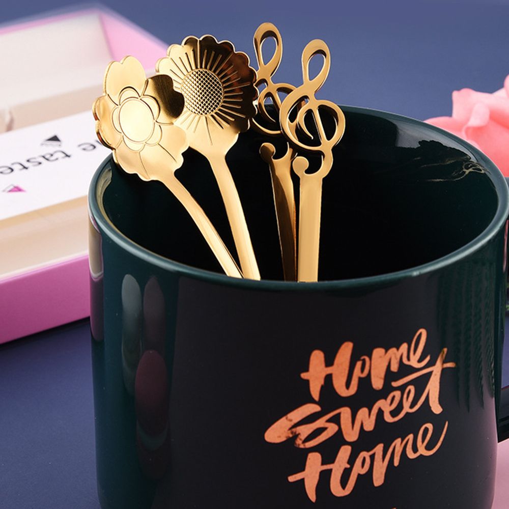 Our spoon set includes 4 pieces of spoons in 4 different flower patterns. The exquisite handle of music note design and four flower patterns including sakura, sunflower, coreopsis, and heronsbill. Food-grade 410 stainless steel with integrated molding. Perfect gift for tableware enthusiasts and collectors.
