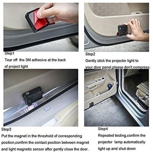 - 2. Install instruction of the shadow light: Stick the Magnet on the bottom of the car frame. Stick the car light on the car door. The distance between the Magnet & Car light is about 10mm. When you close the car door, the Magnet is at the under face of the sensor on the car logo light.