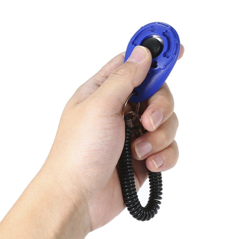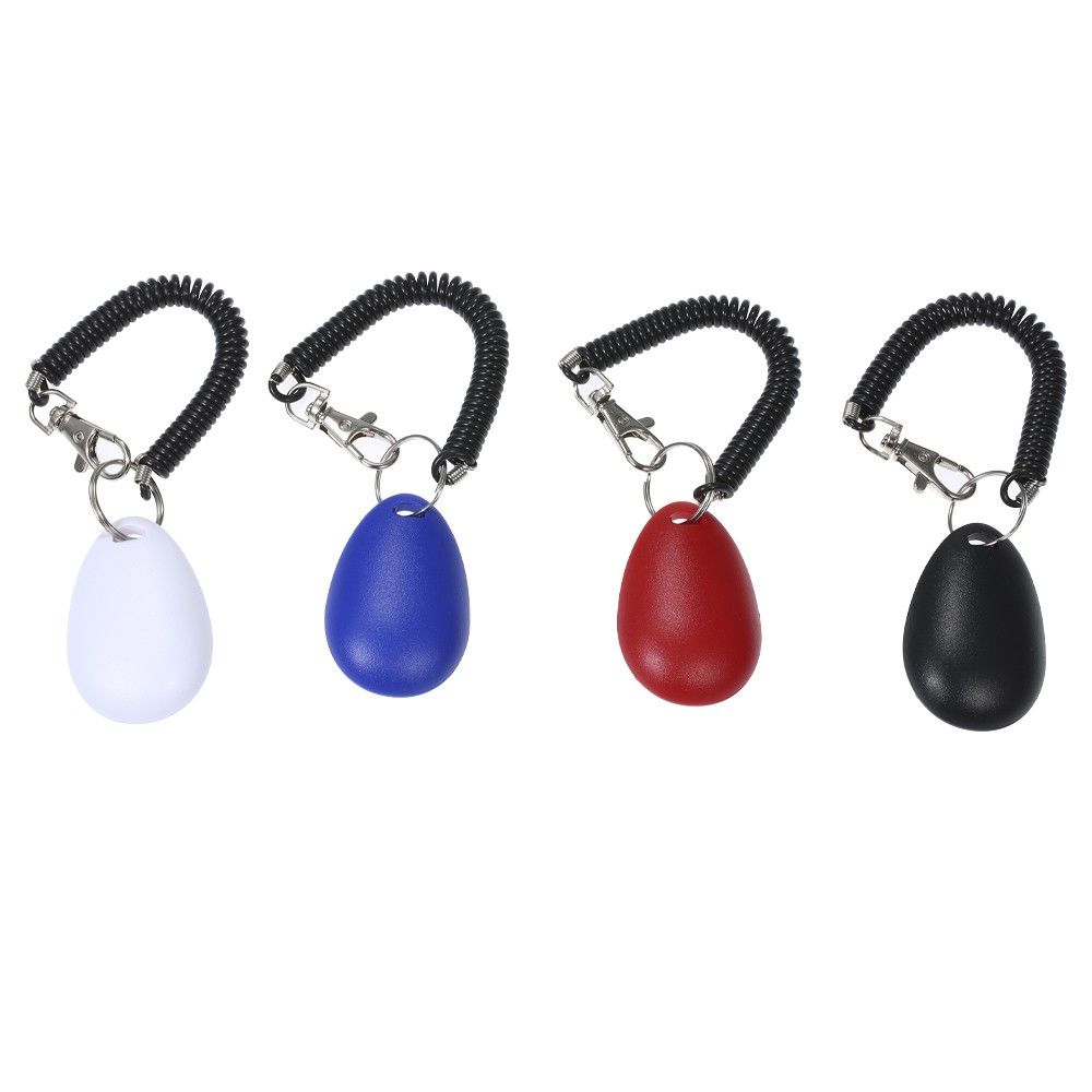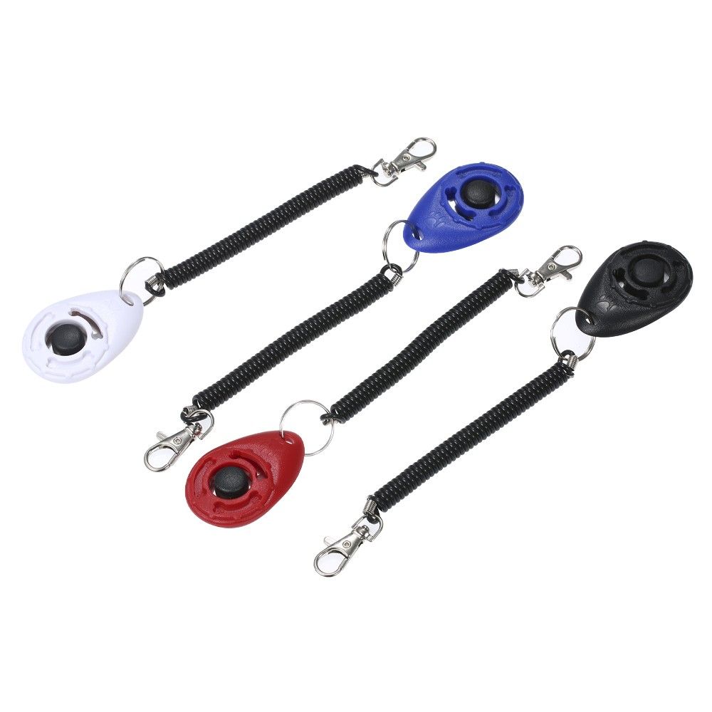 Set of 4 pet training clickers in black, white, red, and blue.