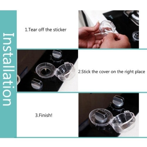 The set contains stove knob covers. Very simple for adults to install. You can use the tape to install, no tools needed. The adhesive strength will reach its optimum after 24 hours. It is very easy for adult to open the cover. Press the double buttons to open it. No worries when you remove the tape. 3M VHB Tape will not leave marks on your stove.