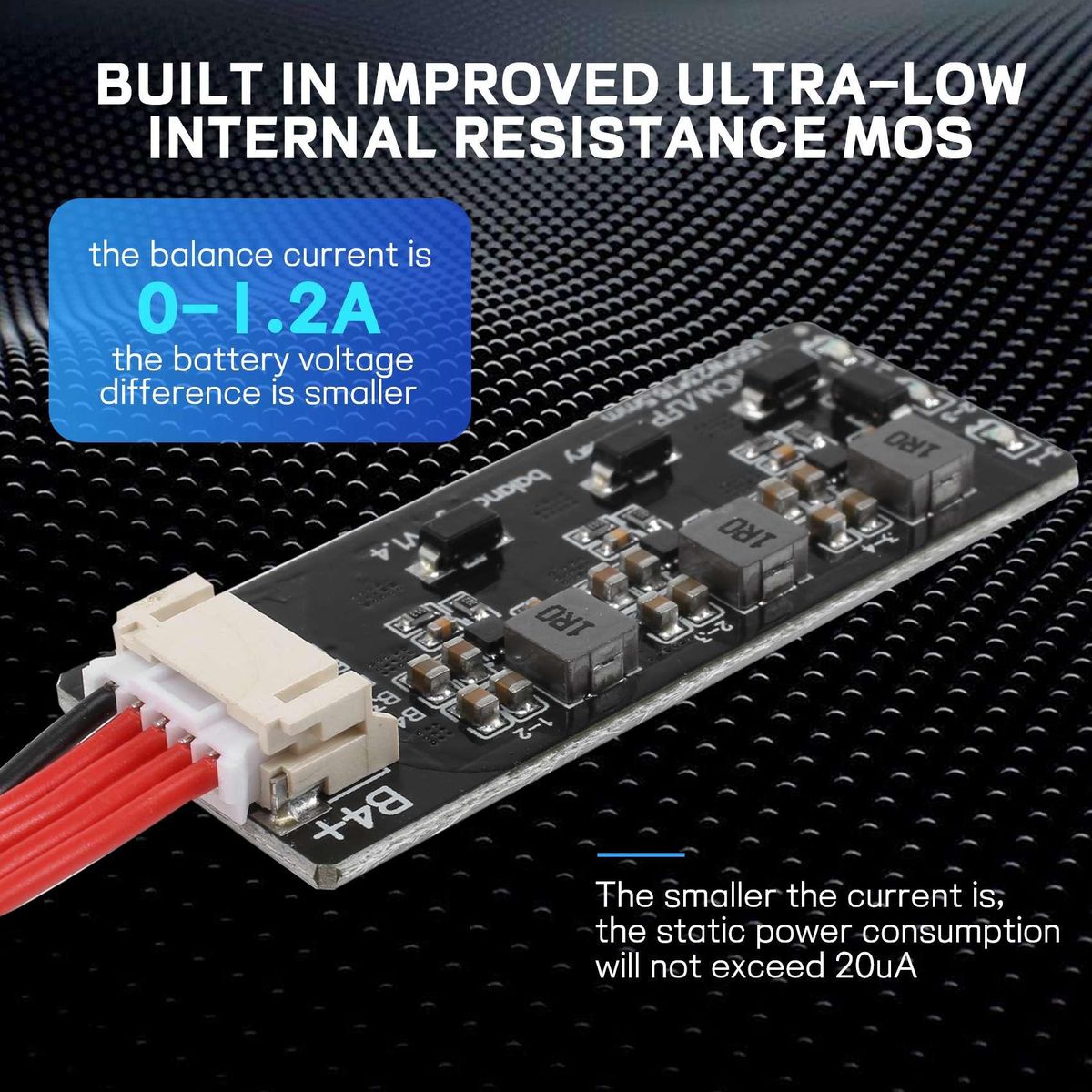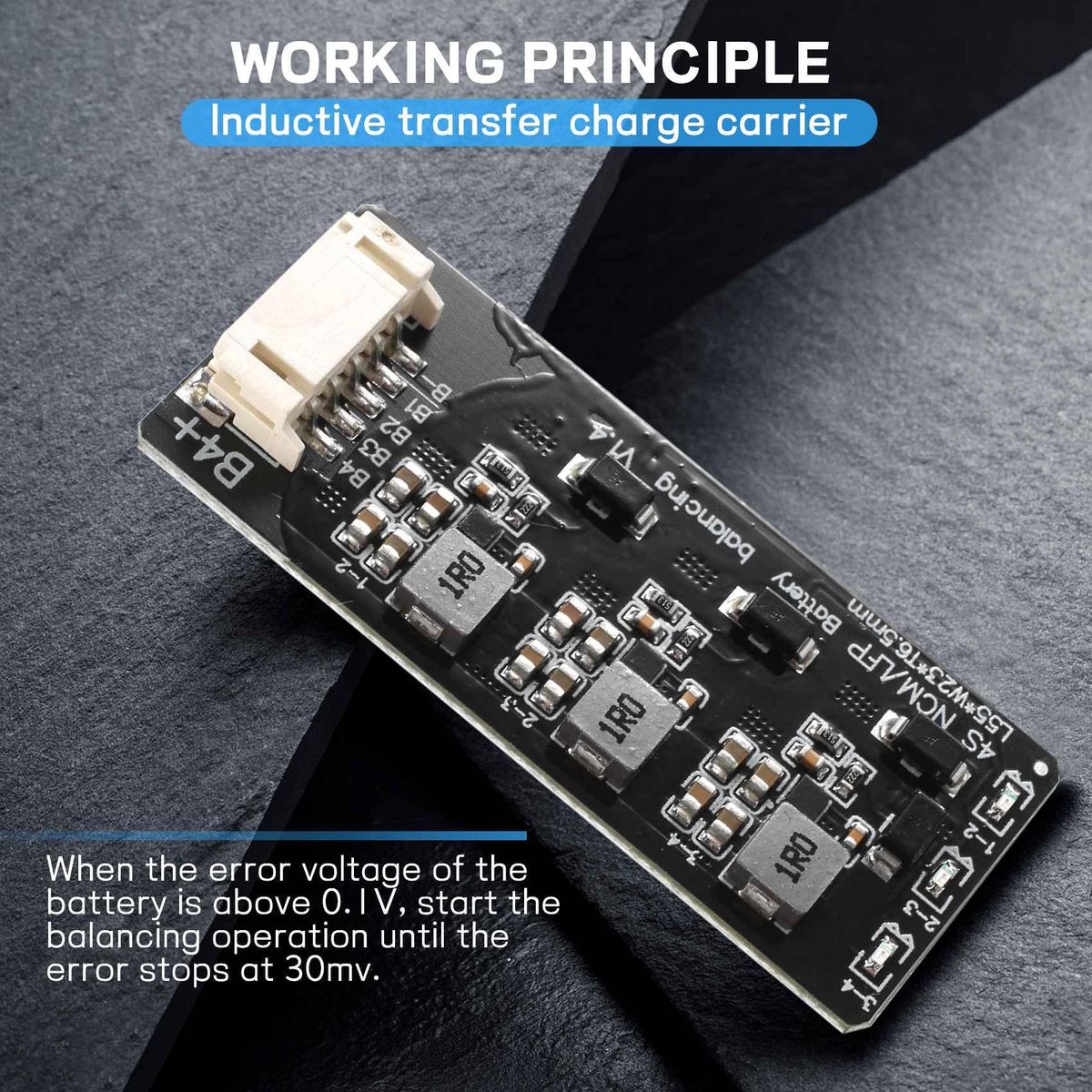 Working principle, the inductor converts the charge . When the battery error voltage is above 0.1V, the balance work is started until the error is stopped at 30mv. The built-in improved ultra-low internal resistance MOS, the balance current is 0-1.2A, and the battery voltage difference is smaller. The smaller the current, the static power consumption does not 20uA! With balance instructions!