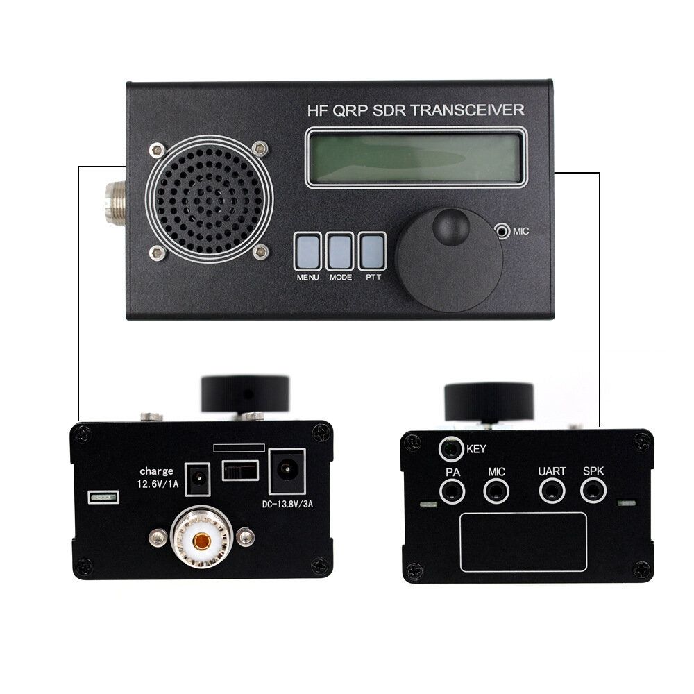 USDR/USDX HF QRP SDR Transceiver SSB/CW Transceiver 8-Band 5W Ham Radio With Black ShellDescription:USDR/uSDX is a pocket-sized 8-band SSB/CW QRP transceiver. Designed with built-in lithium battery, built-in microphone, PTT button and extremely low RX current consumption, it is a good partner for SOTA, POTA or any other portable activities.This QRP SSB/CW shortwave transceiver has a 1602 screen, built-in battery, a charger, built-in microphone and speaker. It can be connected to automatic buttons. It can also CW decoding.Features:1. Using durable IRF series transmitting tube2. Can be used to connect to an antenna (instrument base)3. Aluminum laser shell marking, all aluminum buttons, with translucent silicone buttons4. The original qcx circuit is greatly simplified, and the installed components are reduced by 50%. No complicated transformer windings. No wiring procedures. The most cost-effective and easy to constructFunction List:* Eer e-level drives the ssb transmitting stage* 13.8v power supply about 10w ssb pep output* Support full modes: usb, lsb, cw, am and fm-dsp* Filter: 4000, 2500, 1700, 500, 200, 100, 50hz passband* DSP function: automatic gain control (agc), noise reduction (nr), voice trigger, voice trigger xmit, attenuator rx (att), tx noise gate, tx drive control, volume control, and dbm/s-meter* Ssb reverse sideband/carrier suppression transmission: better than -45dbc, imd3 (dual tone) -33dbc; reception: better than -50dbc* Support multi-band. Continuously adjustable in the 160m-10m frequency range (loss of 20khz performance)..99mhz* Open source firmware, built in ide; allows experimentation, can add new functions, can share contributions through github, software complexity: 2000 lines of code* V-based software can be used for fast and complete rogue operations (qsk and semi-qsk), or auxiliary execution in digital mode (without cat or ptt interface) for rx/tx switch, with tx/pa delay control external ptt output -Simple installation and modification, 8 component changes and 8 lines* Lightweight, low-cost transceiver: Thanks to the eer electronic liquid level transmitter, it has high power efficiency (no need for a huge heat sink) and simple design (no need for complex balanced linear power amplifiers)* SSB transmitter phase is completely based on digital and software: control the phase of the si5351 PLL (through small i2c frequency changes over 800kbit/s) and the amplitude of the PA (through pwm to pwm) to test the microphone input and reconstruct the SSB signal. Key shaping circuit PA)* All-digital and software-based SDR receiver stage (optional): I/Q signal (complex) is sampled from the quadrature sampling detector digital mixer, and perform 90 degree phase shift (Hilber transform) software in it and delete sidebands by adding* Three switchable analog controllers independent of the front receiver* 0db, -13db, -20db, -33db, -53db, -60db, and -73db* Mds receiver noise level: -135dbm (200hz bw) at 28mhz* Pre-receiver selectivity: steep frequency adjustment -45db/ ten times roll-off +/- 2khz* Blocking dynamic range: 20khz 123db, 2khz 78db* CW decoder, direct/iambic-a/b keying-Vfo a/b + rit and frequency division, and switch the corresponding relay with filter through i2c-Cat support (TS480 subset), which can be streamed through CAT transmission of audio, keystrokes and display textInterface Introduction:* Charging: Built-in lithium battery charging port, only use the included charger! It is forbidden to use chargers by other producers* Switch: off. Bat: built-in battery power supply. 13.8: external power supply* DC13.8v/3a: External power interface* Key: Automatic key body connection (a, b, single key)* Pa: external power amplifier, ptt signal* Mic: External microphone interface* Uart: Serial communication (TS-480 compatible command)* Spk: external speakersPackage Included:* 1 x Transceiver* 1 x Power Adapter