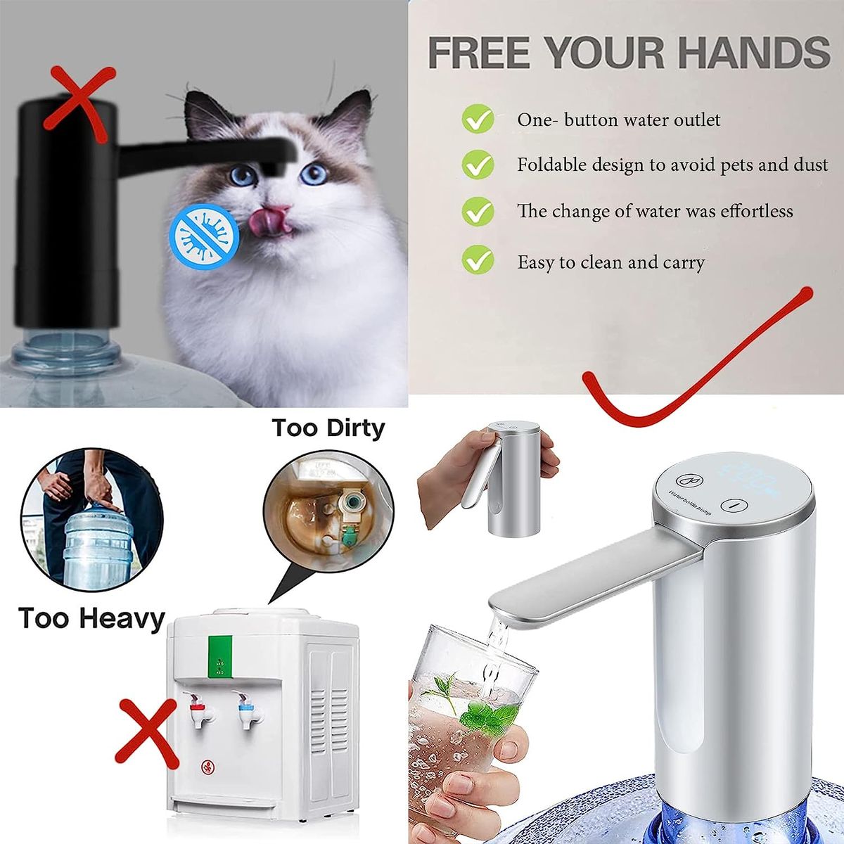 Product upgrade】As our latest design, make your life easier. The Folding water outlet design effectively reduces dust and pet contact, allowing you to enjoy clean and safe drinking water. 【High Capacity Battery】The electric water dispenser with built-in rechargeable 1200mAh battery. A full charge lasts 25-35 days or about 8 bottles of 5 gallons of water. The water dispenser takes up less space when folded, it is more clean and easy to carry in the storage bag, it is very suitable for home, office, picnic, beach day and barbecue. 【Food Grade Material】The water dispenser for 5 gallon bottle uses high density ABS plastic and food grade silicone hose, passed EU RoHS, BPA free, non-toxic, no peculiar smell, specially designed for food and drinking, and has CE, quality inspection report, etc. Certification.