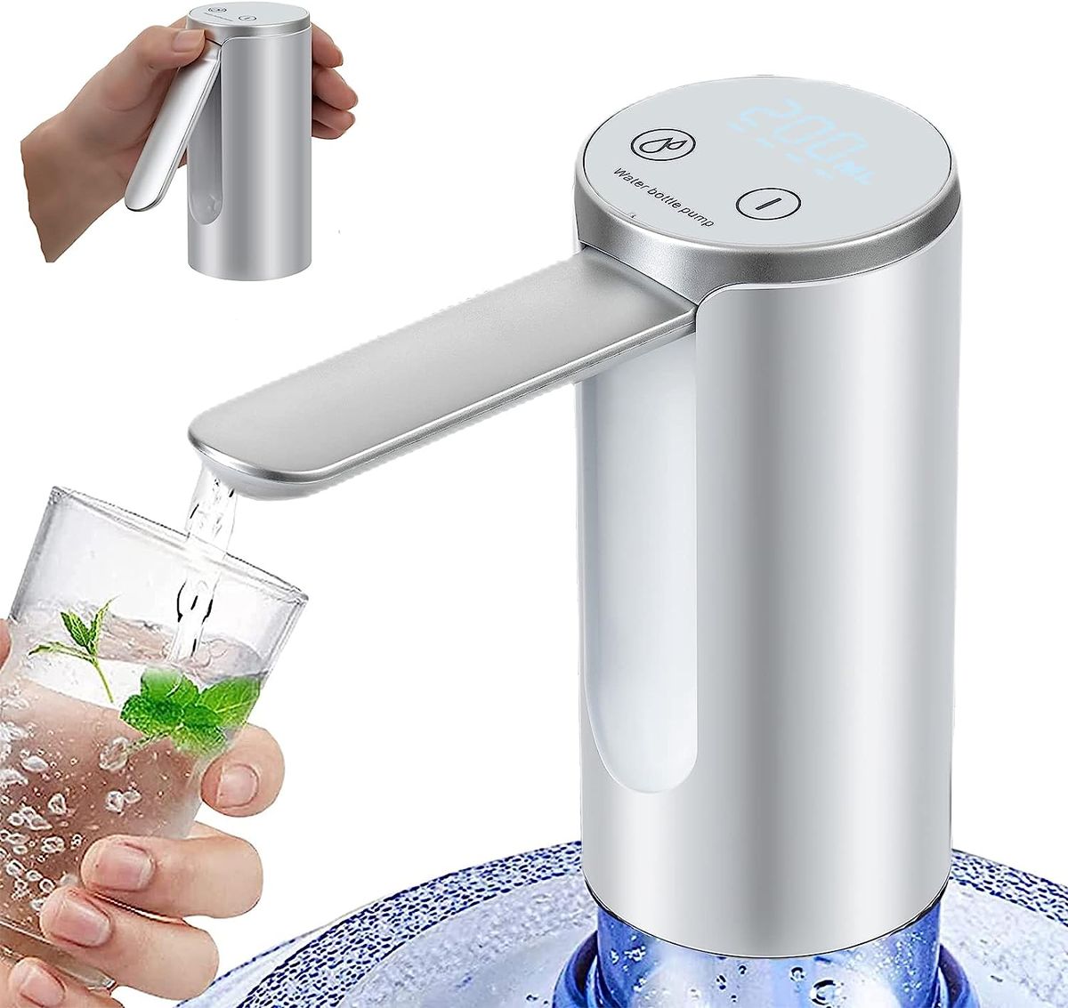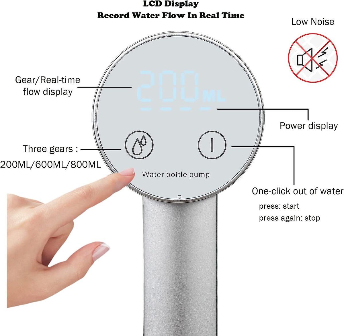 Digital display intelligence】New digital display water bottle pump, touch screen start. Mode 1: Auto-off function, respectively 200ML、600ML、800ML, real-time recording of water volume, clear reading. Mode 2: Manually control the water outlet time, press the switch to stop, and the operation is simple. Have more fun in baking, cooking, brewing tea, coffee, milk, suitable for the whole family. 【