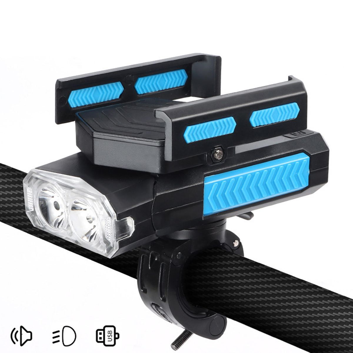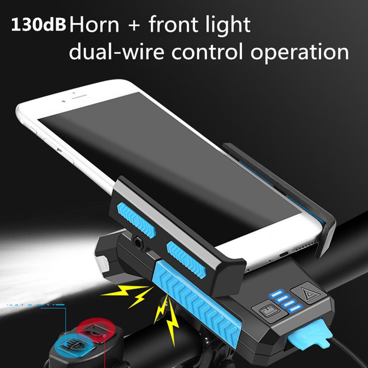5 in 1 Headlights, mobile phone holder, charger, horn, emergency lights, not cumbersome, more simple and convenient; clear and crisp sound, with 130 dB speaker;HD 400 lumen T6 double lamp , 45 ° rotatable lamp , three lighting modes;4000mAh large capacity battery, integrated charging and discharging, independent charging and discharging interface;four gear power indicator, shock absorption and anti-skid, no harm to mobile phone;
