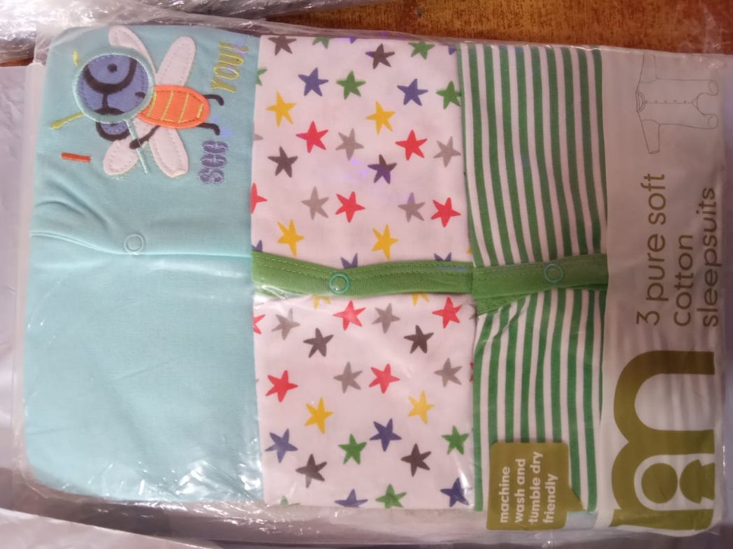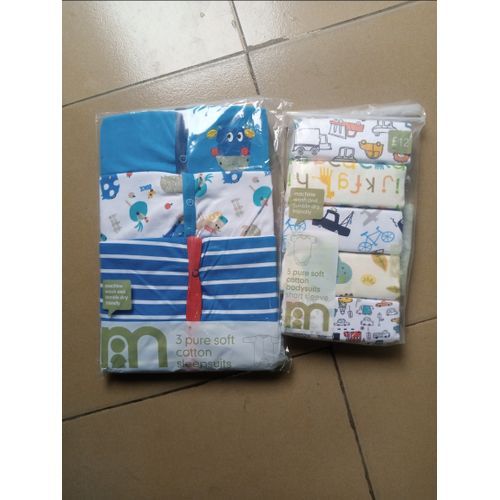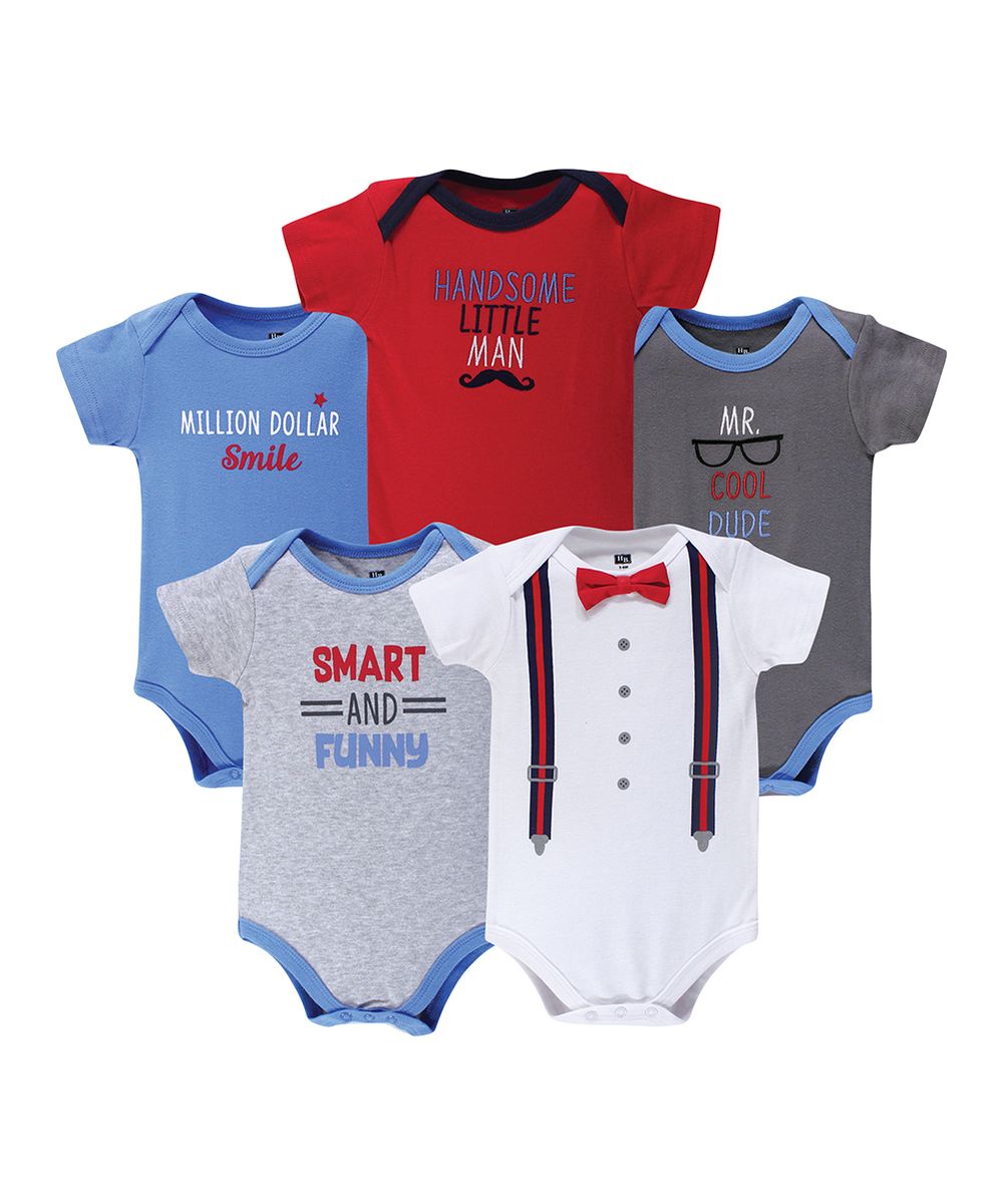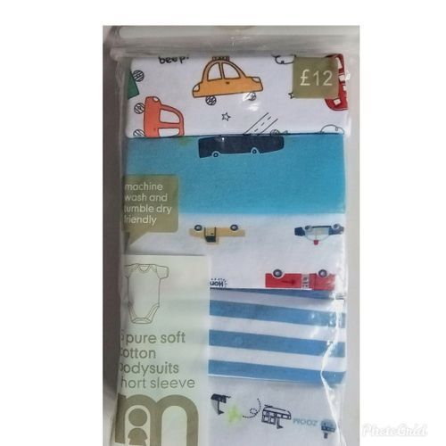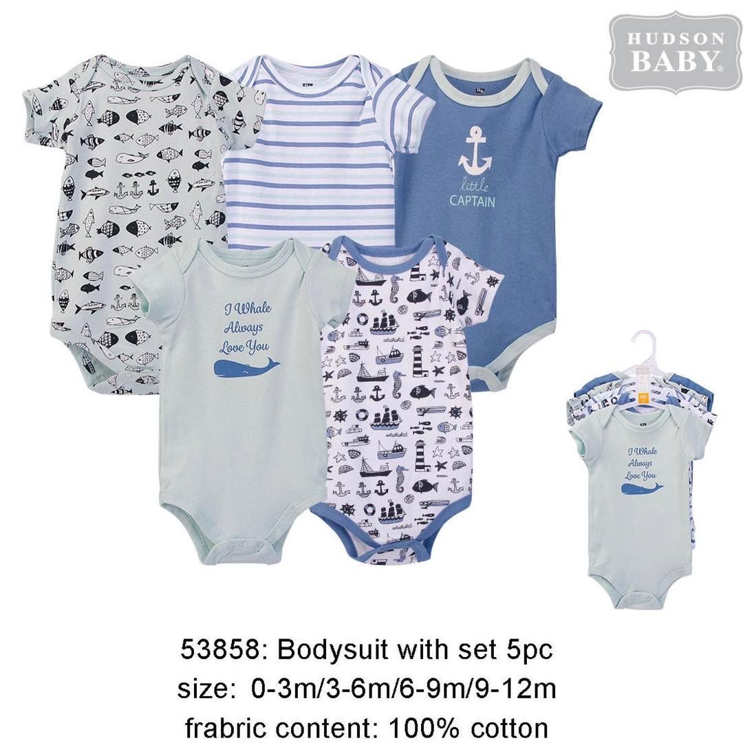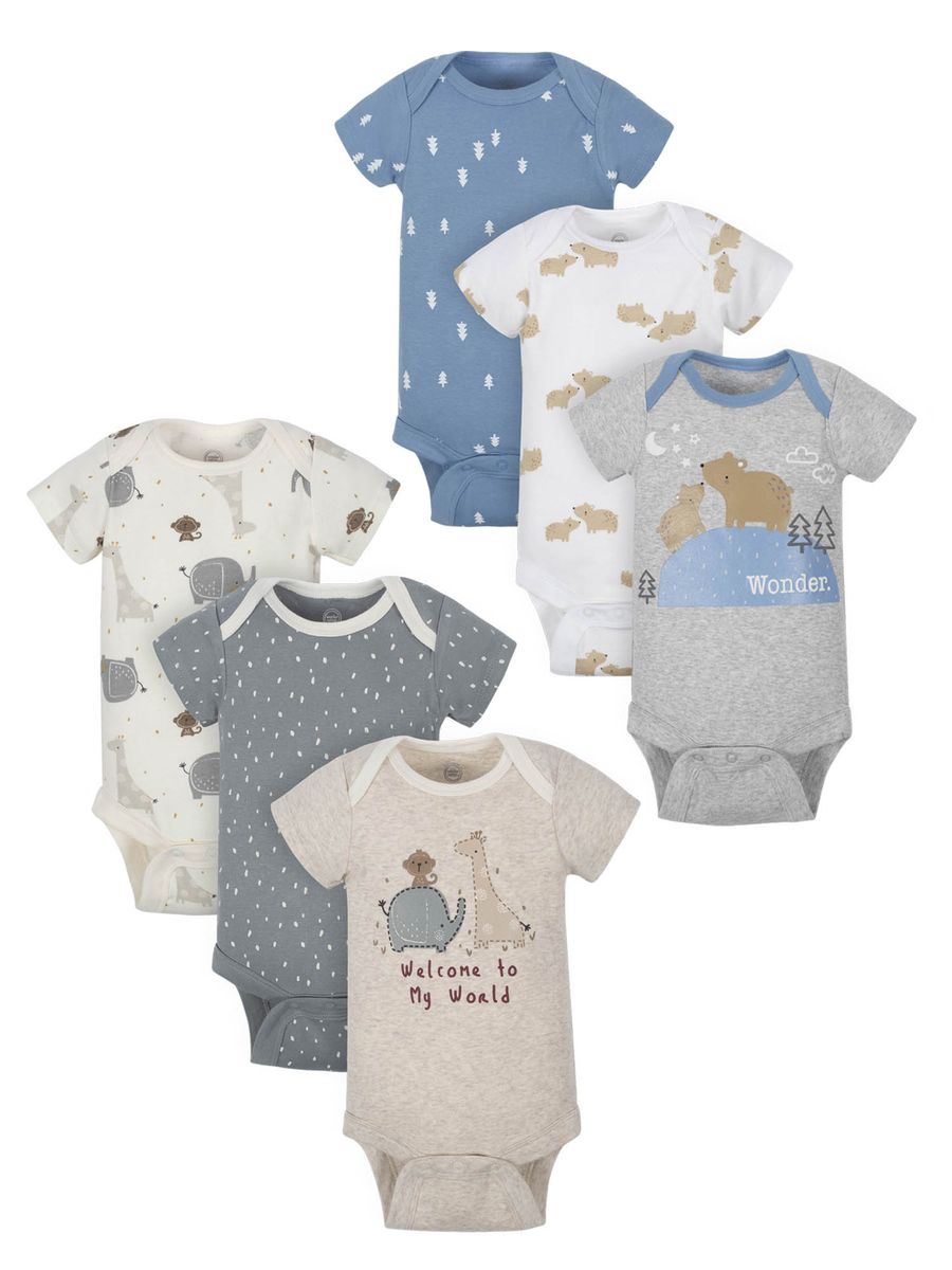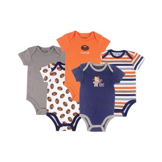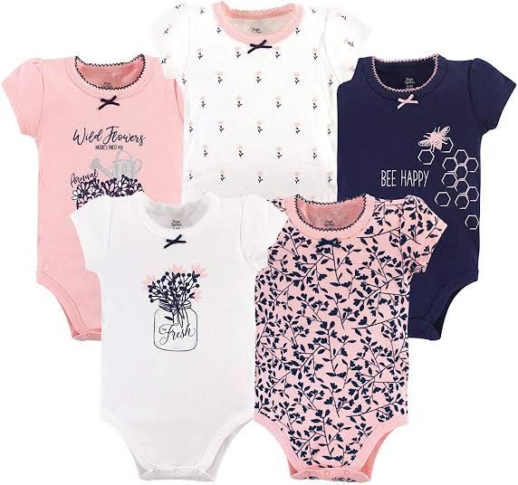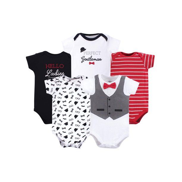 5-Pack Hanging Bodysuits are made of 100% cotton for the softest touch on your baby's gentle skin. Bodysuits are essential to any baby's wardrobe, and these bodysuits are so comfortable that they can be used as underwear or even on their own. Assorted with printed designs, sayings, and prints; available in boy and girl designs and fits up to 12 months.