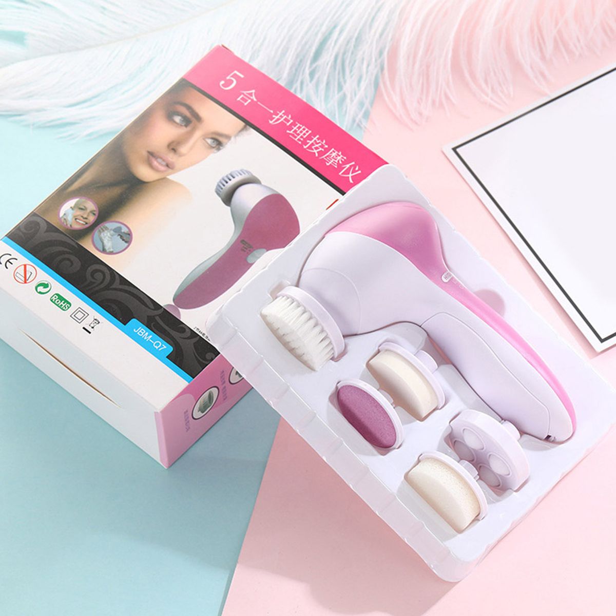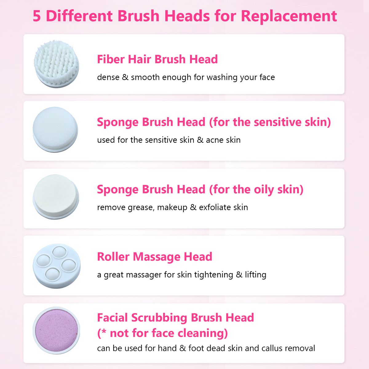 5 Different brush heads for replacement, can be used for face cleaning, facial skin massage, makeup removal and so on.