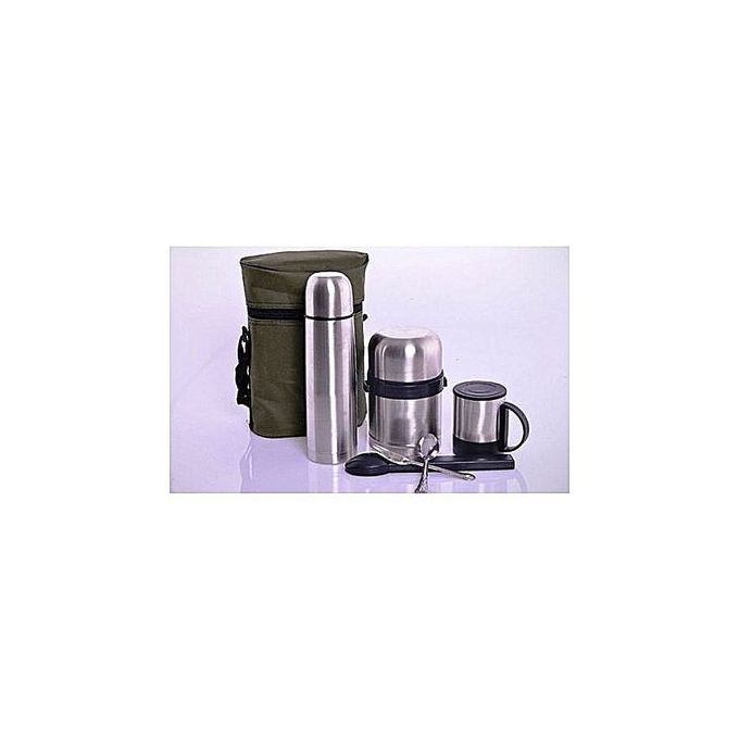 Set of 5 gift pack is an ideal gift for grown up and kids alike when going to school, work or take along when on a road or field trip. the vacuum food container and flask keeps your beverage and food hot or cold as you desire and its stainless steel design makes it durable and easy to maintain and it also come with a carry bag for easy storage and movement.Consist of Water Flask, Food Flask, Cup, Spoon and Fork and a carry bag. Capacity of Food Flask: 500ml. Capacity of Water Flask: 500ml. Capacity of Cup: 220ml