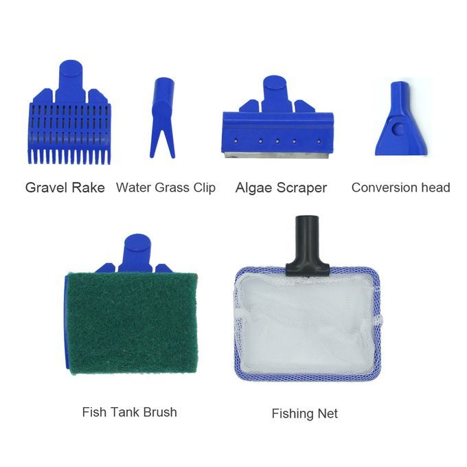 1x Rod,1x The head of fish net,1x The head of water grass clip,1x The head of fish tank brush,1x The head of algae scraper,1x The head of gravel rake,1x Conversion head