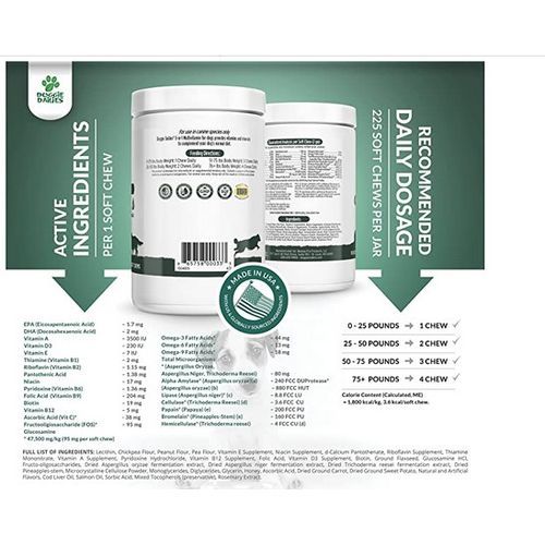 Love The Results Or Your Money Back: Our dog multivitamins are proudly made in our GMP-compliant, Level 3 SQF certified facility in the US. When you become a customer, you become a part of the Doggie Dailies family. Order our 5-in-1 multivitamin for dogs and you'll receive passionate customer service