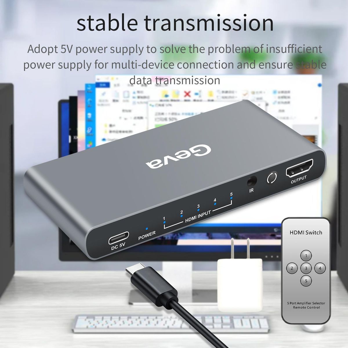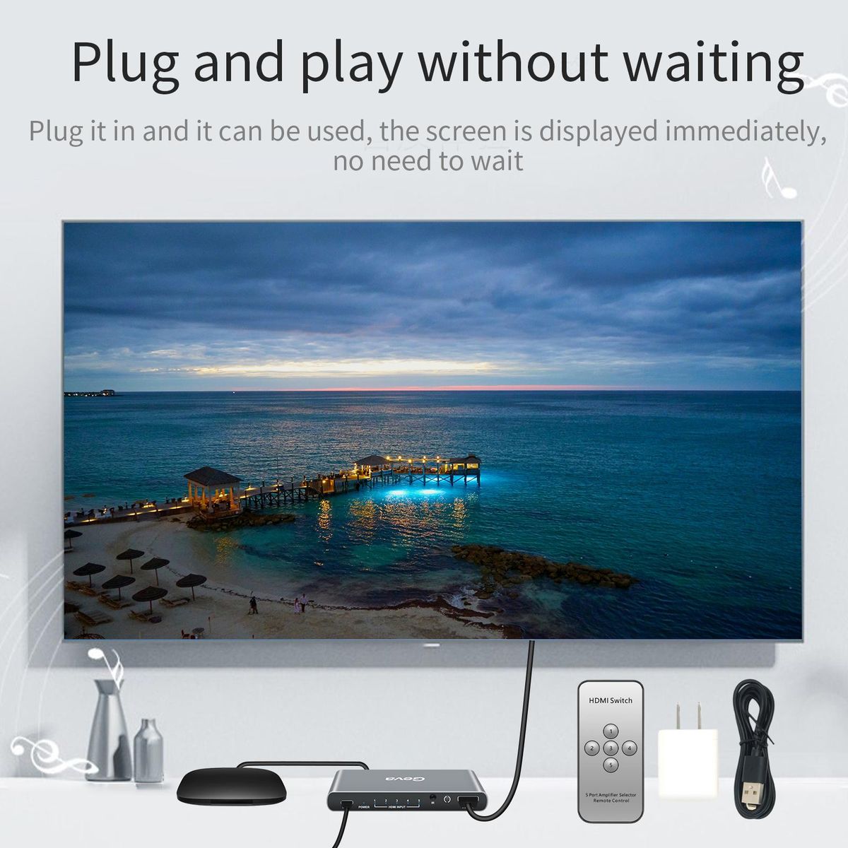 1 Piece 5 Port 4k HDMI Switch Selector1 Piece Remote Controller 1 Piece Power Cable 1 Piece Power Adapter1 Piece Manual