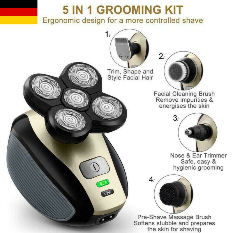 100% naneu und hochwertig gefertigt. Dieser Rasierer ist multifunktional mit fnf abnehmbaren Kpfen und bietet Ihnen alles, was Sie fr das Haarschneiden und die Gesichtspflege bentigen (Sie knnen weise nur den Rasierer oder den Rasierer mit allen Ersatzkpfen whlen). Mit dem ergonomisch geformten Rasierer mit fnf Kpfen haben Sie beim Rasieren die volle Kontrolle. Der Scherkopf ist waschbar und bietet Ihnen den ultimativen Komfort und die Geschwindigkeit, die Sie bentigen. Kabellos und wiederaufladbar - Mit einer Ladezeit von 5 Stunden knnen Sie den Trimmer 60 Minuteng verwenden. Die Bedienung mit einer Taste macht die Verwendung noch einfacher. Spezifikationen: Name: 4D wiederaufladbarer Glatze-Rasierer Material: ABS (Acrylnitril-Butadien-Styrol-Kunststoff) + Edelstahl Nennspannung: 100-240V Frequenz: 50/60 Hz Leistung: 3W Eingangpannung: 5V Ausgangsleistung: 1W Leistungstyp: Wiederaufladbar Aufladen: 5 Stunden Ausdauer: 60 Minuten Paket beinhaltet: (NUR RASIERER, NICHT 5 IN 1 KIT) 1x Rasierer 1x Ladegert 1x Brste reinigen 1x Handbuch Paket beinhaltet: 1 x Elektrorasierer 1 x USB-Ladekabel 1 x Nasenhaarschneidekopf 1 x Przisionstrimmerkopf 1 x weiche Schwammbrste 1 x Gesichtsreinigungsbrste 1 x Reinigungsbrste