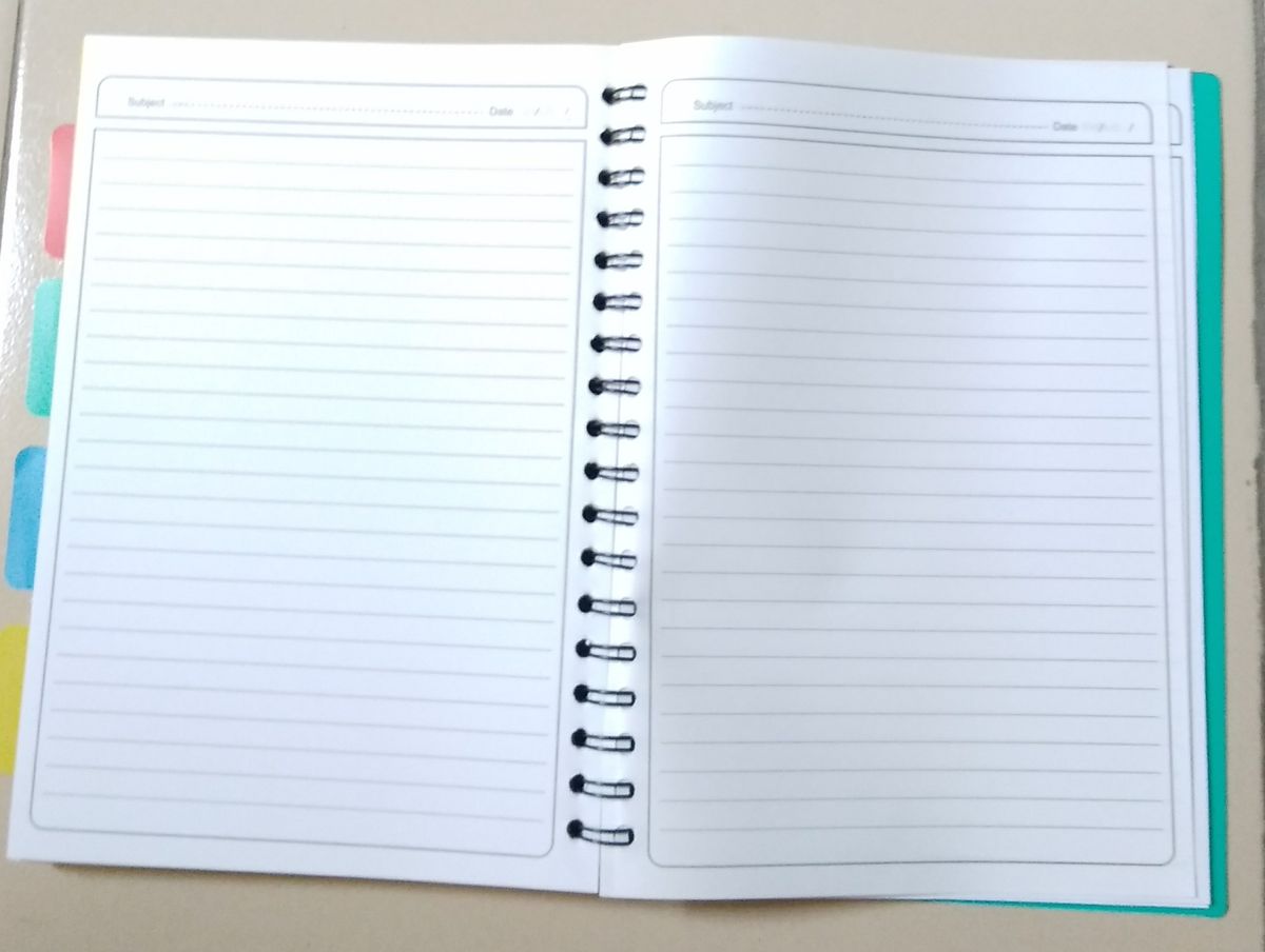 5 subject and spiral bund notebooks. There are different courses in a day but you only need to carry with the multi-subject notebook. It's wire bound, each page is divided so that other pages will not get damaged when tear out one of them or a few