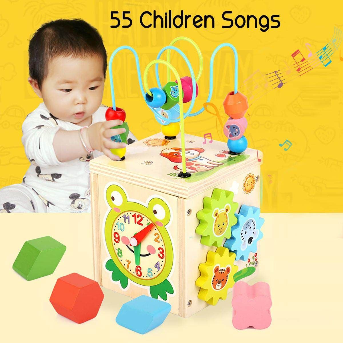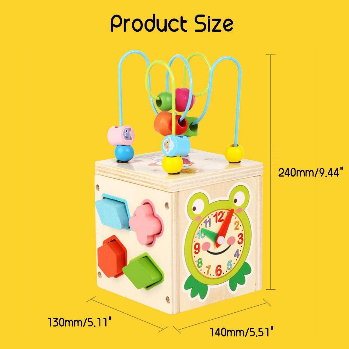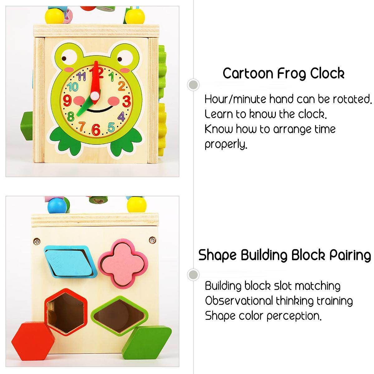 - 5 Sides of Activities: This baby activity keeps child entertained with Animal Gear Set, Cartoon Frog Clock, Shape Building Block Pairing, Animal Round Beads Maze, Basis Abacus.