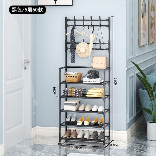 Standing tall in fashion and with functioning simplicity design and style, this elegant coat stand will let your hallway, entryway or balcony more organised.It is really part of an essential unit of your daily life.This unit offers you a clutter free home and a comfortable life.With the precisely design, the screws locate in the hole well and the holes are line up with the shelves.The metal outer layer is painted by baking varnish, being rustproof.A perfect coat rack and shoe storage bench, allow you to hang your clothes, bags, umbrellas, and store your shoes, storage boxes handbags in a limited space.Material: MetalStyle: ModernAssemble Size: 60cm L * 26cm W * 171cm H