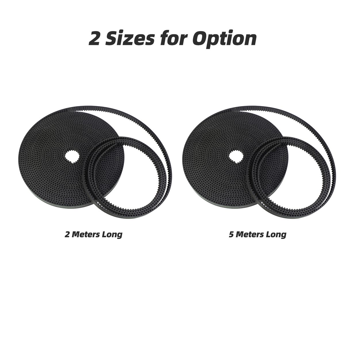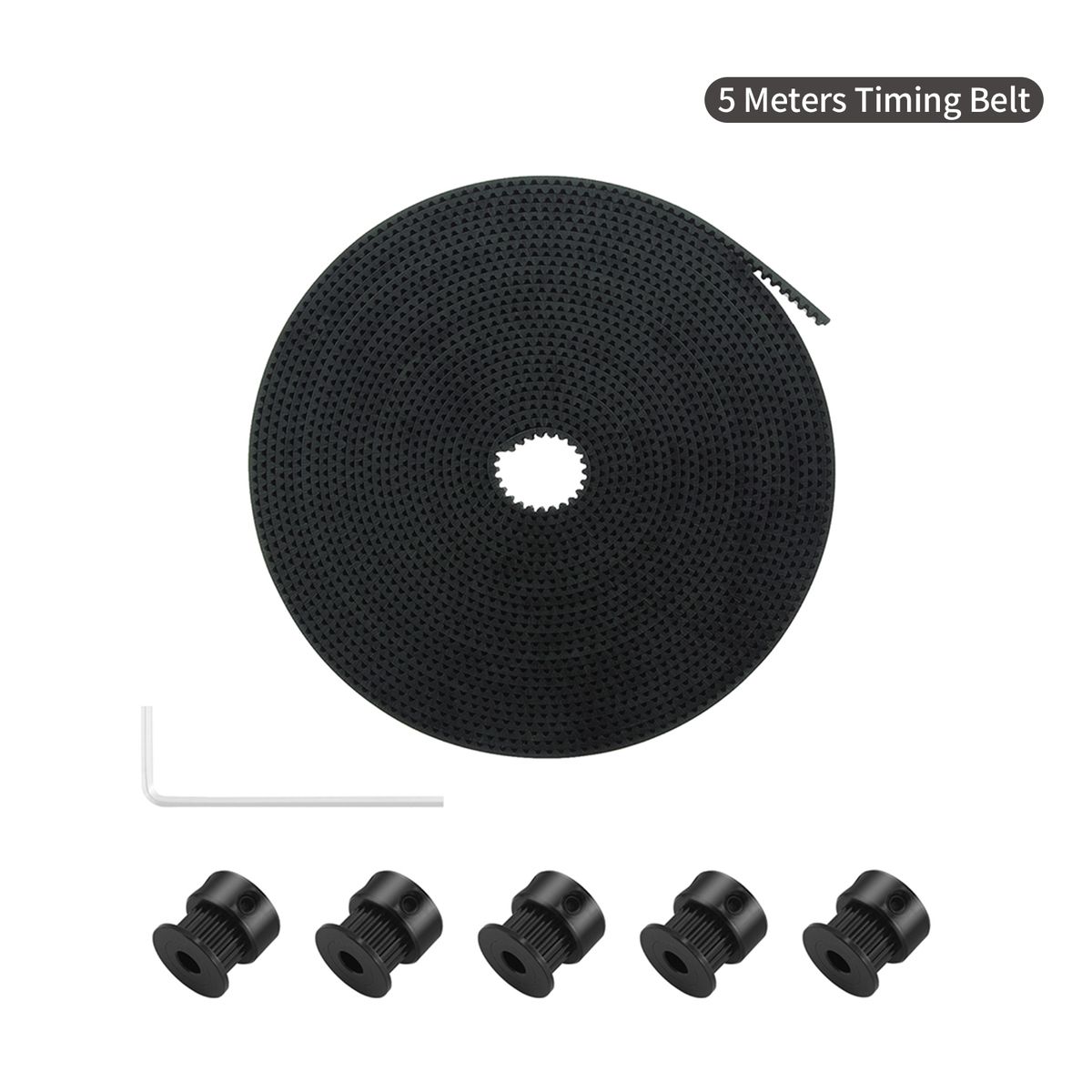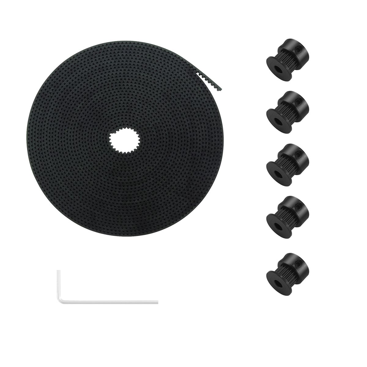 Features:The timing belt is made of premium rubber, better quality and more durable.Specifically designed for linear motion, high positioning accuracy.20 Teeth pulley wheel contact with the belt, which minimizes the risk of the belt slipping.GT2 pulley and belt are used together, very convenient to use.Compatible with most 3D printers.Specifications:-GT2 Timing BeltColor: BlackMaterial: RubberLength: About 5 Meters/2 Meters(optional)Width: 6mm-GT2 Pulley WheelMaterial: MetalTeeth: 20Diameter of Bore: 5mmPacking List:1 * Timing Belt(5 Meters)5 * Pulley Wheels1 * Wrench