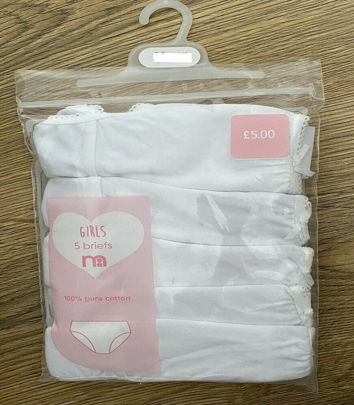 Girls 5 pack briefs is 100% combed cotton lovely quality briefs with 100% cotton. The pack contains white colour, which is Ideal for wearing under school uniform or at any other time of year. Available in age 2-12 years.