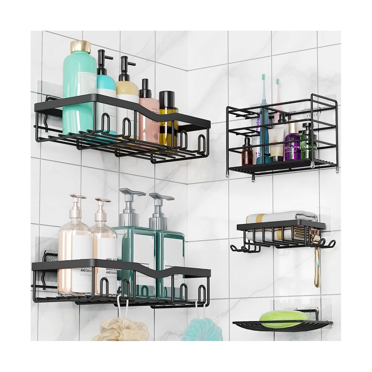 Multiple Usage: Our bathroom shower shelves set include 2 shower caddies,2 soap holders,1 toothbrush holder and 6 adhesives. Our shower caddy provide enough space to storage your daily products what you need in the bathroom, Not only you can use them in the bathroom but also in the kitchen, bedroom, or any p you want.