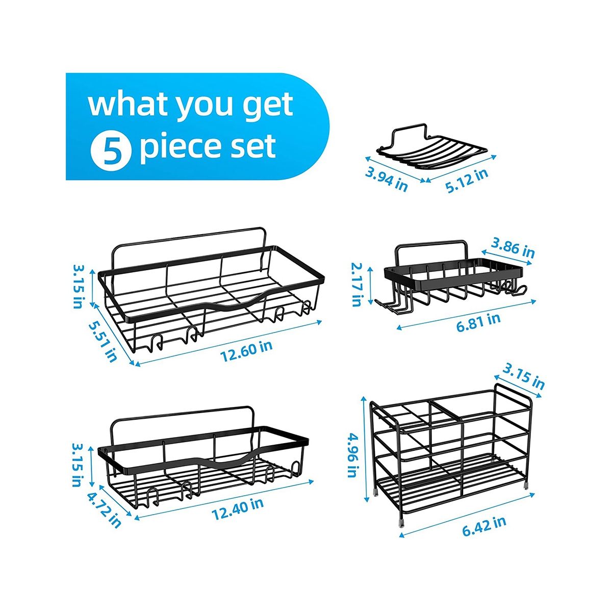 Package Contents: Our package includes 2 different size hanging shower caddy baskets, 2 soap dish holders, 1 toothbrush holder and accessories 6 x adhesives