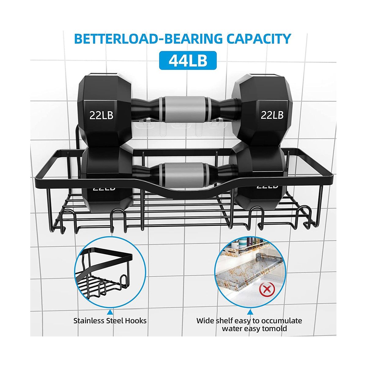 Easy Installation: No drilling required, no damage to the wall. Mark where the adhesive will be p with shower shelves attached, stick the adhesive and mount the shelves.