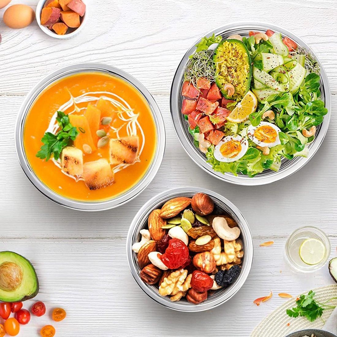 HEALTHY & DURABLE : Mixing bowl set is made of high quality stainless steel with no hazardous material, study construction and resistance to deformation, not like the glass serving bowl, rustproof and healthy for your daily use.Good as a self-serve bowl with rice, noodles, salad, cooked vegetables, etc.