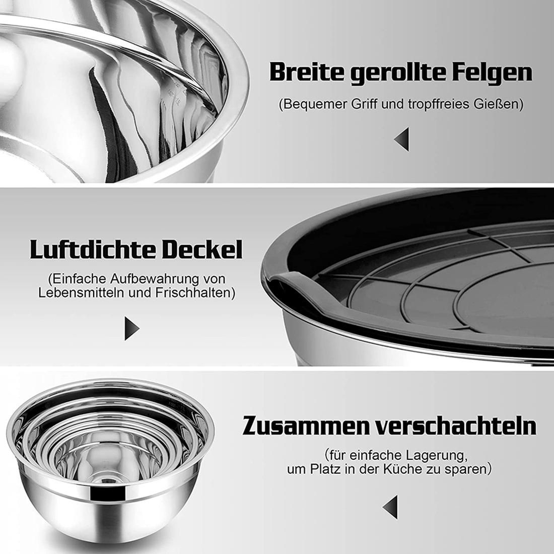 CONVENIENTLY DESIGNED : This bowl set comes with 5 airtight lids to keep fresh and healthy when stored, Freezer safe, Flat bottom would give the bowl while mixing, One-piece construction and no worry about leakage.The roller edge makes it easier to hold the bowl and prevents food and liquid from dripping out.