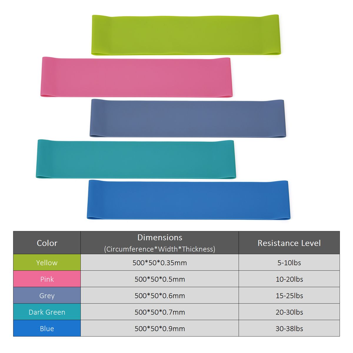 Resistant Level: (Yellow)5-10lbs (Pink)10-20lbs (Grey)15-25lbs (Dark Green)20-30lbs (Blue)30-38lbs