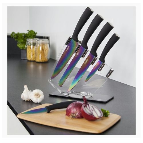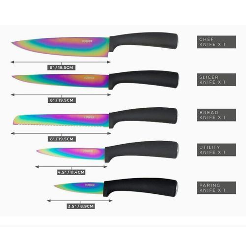 - Comprising of 1 x bread knife, 1 x slicer knife, 1 x chef knife, 1 x utility knife and 1 x paring knife