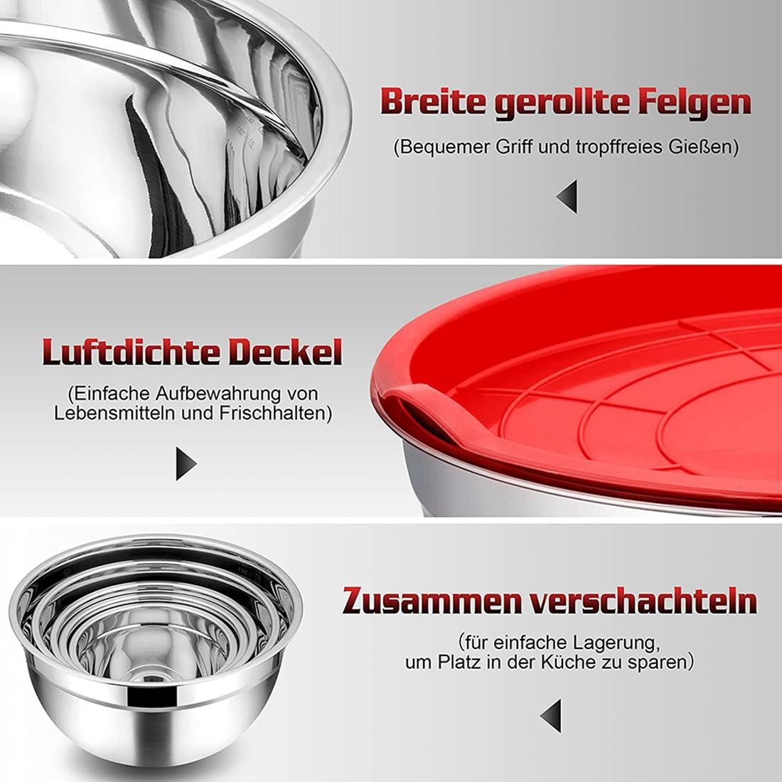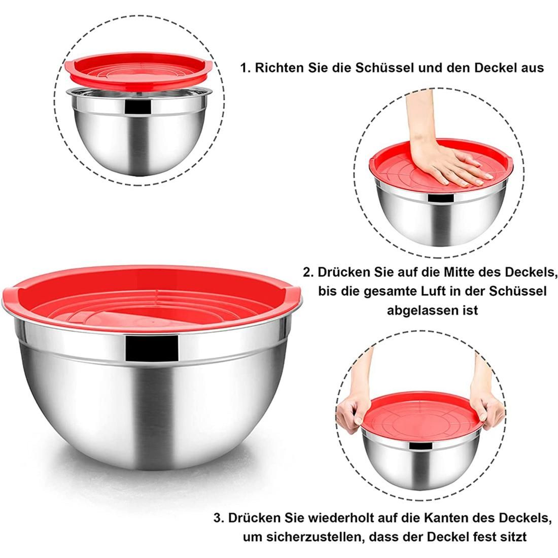 Detailed Information About The Product:HEALTHY & DURABLE : Mixing bowl set is made of high quality stainless steel with no hazardous material, study construction and resistance to deformation, not like the glass serving bowl, rustproof and healthy for your daily use.The thick colored lid covers the bowl tightly, seals the food to keep it fresh, Prevents dust from entering, easy to store in the fridge and freezer.